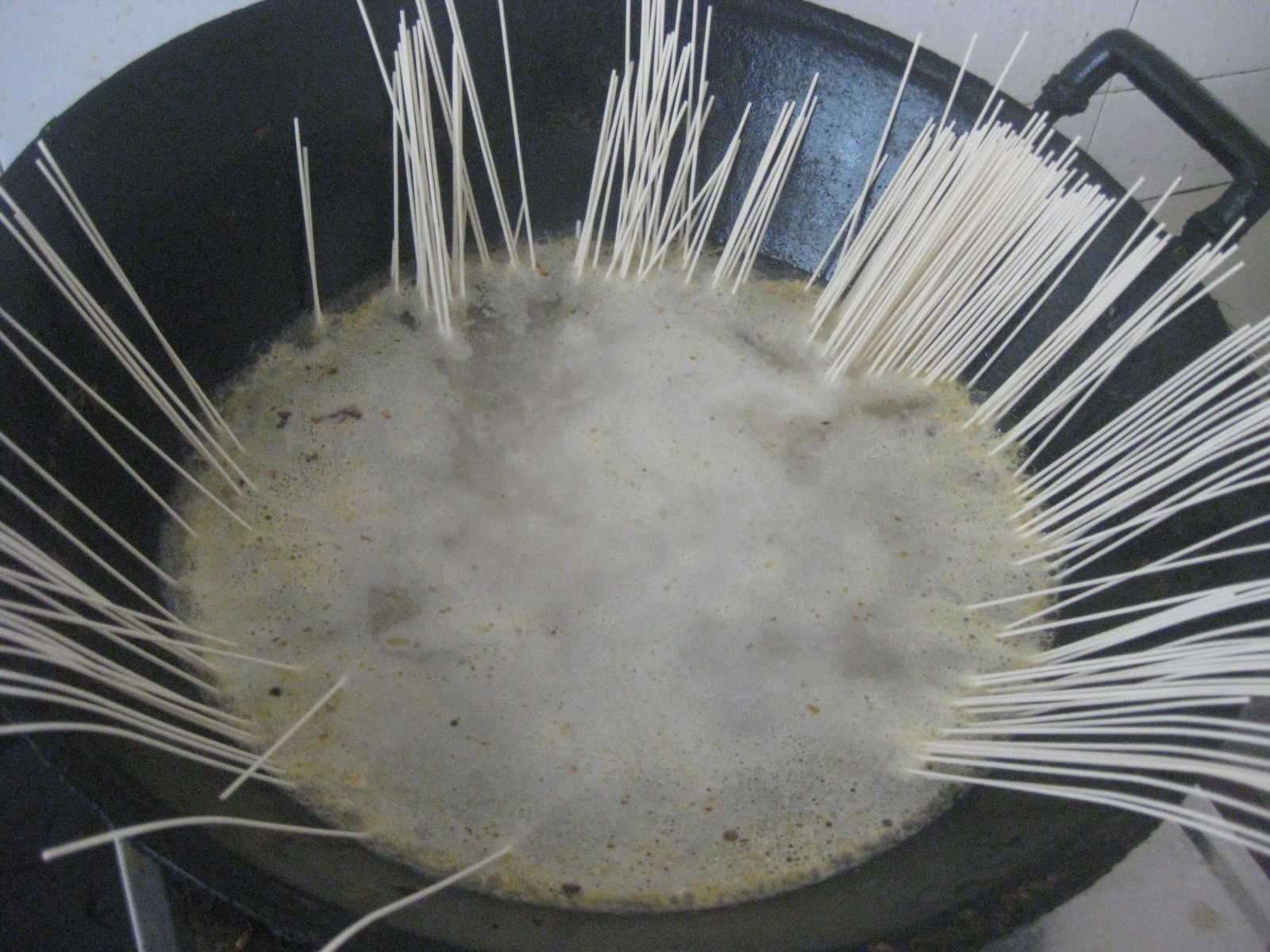 我想着妈妈平时煮面的过程,就是这煮开了。我先给锅里倒些水,然后再把水烧开,最后把面放就锅里。可是我不知道煮多长时间,我就煮一会尝一下,最后尝起来好像熟了,我就捞到碗里。