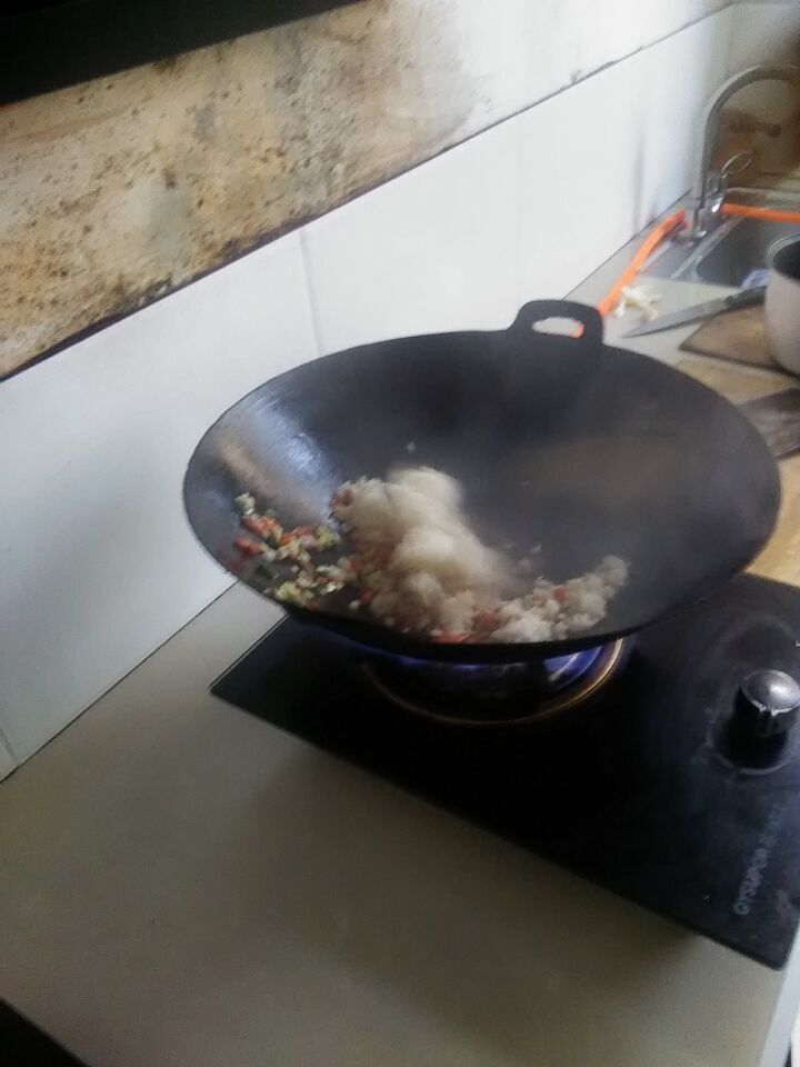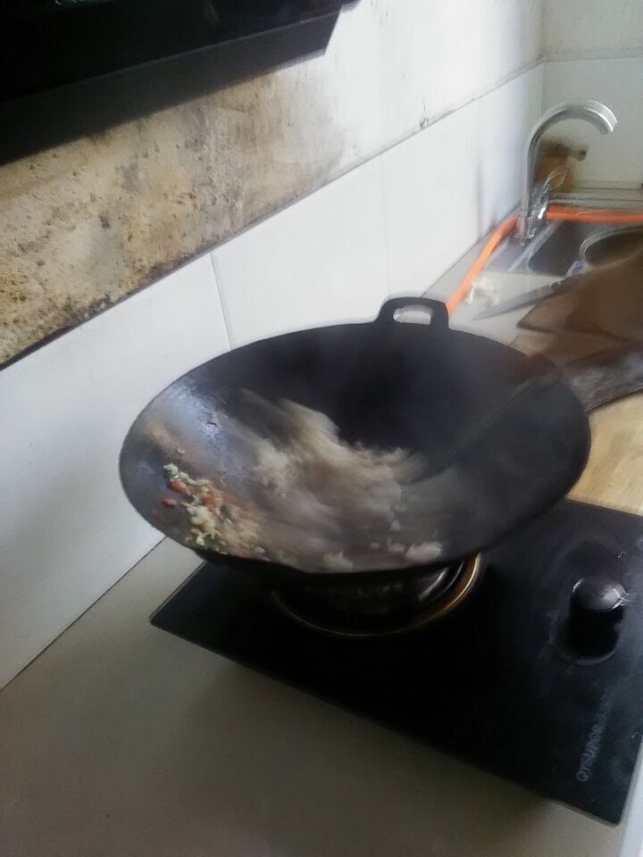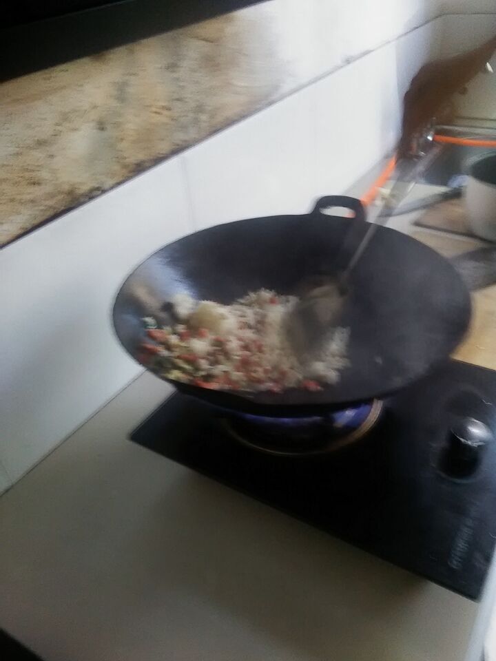 一切准备就绪后,我就在锅里把油倒上,把油热好后,把米倒在锅里热一下,以后再把火腿肠切好,倒在锅里一起在一起热一下,一顿美味的饭就做好了.