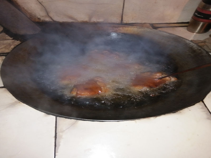 下一步把涂抹好的猪肘子放到锅里用油炸,用油的温度把糖浆的颜色更好的锁在猪肘上,让它更紧致。