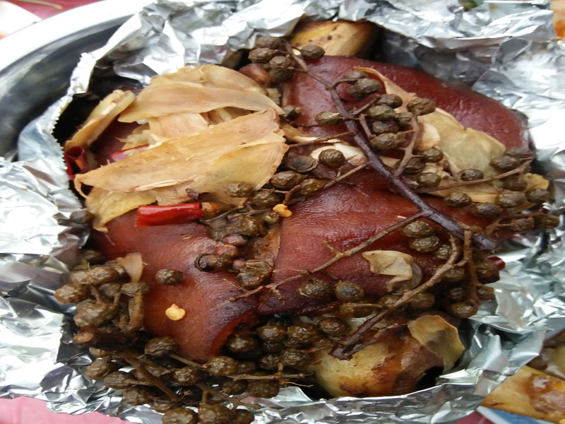 最后,等猪肘子卤好了就把猪肘子放到吸油纸里面再放点姜、青椒、辣椒等配料进去,在开席的时候,把猪肘在龙床里蒸个半小时,最后把吸油纸打开就可以端上席了。一道农村酒席上的特色菜就好了。