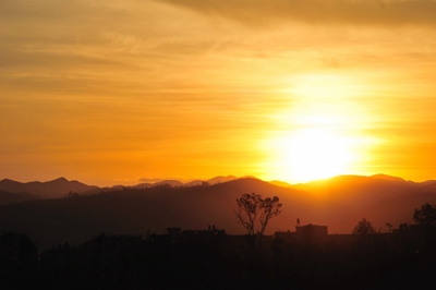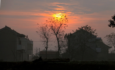 终于东方的树梢上出现了一条奇特的淡蓝色,紧挨着的是红色的朝霞。不一会儿,天空开始由淡蓝色变成灰黑色,红红的朝霞变成了全黄色。终于太阳从树梢里缓慢的爬出来,放射出刺眼的光芒,犹如一根透明的线拉出了一颗椭圆的红灯屹立在空中。