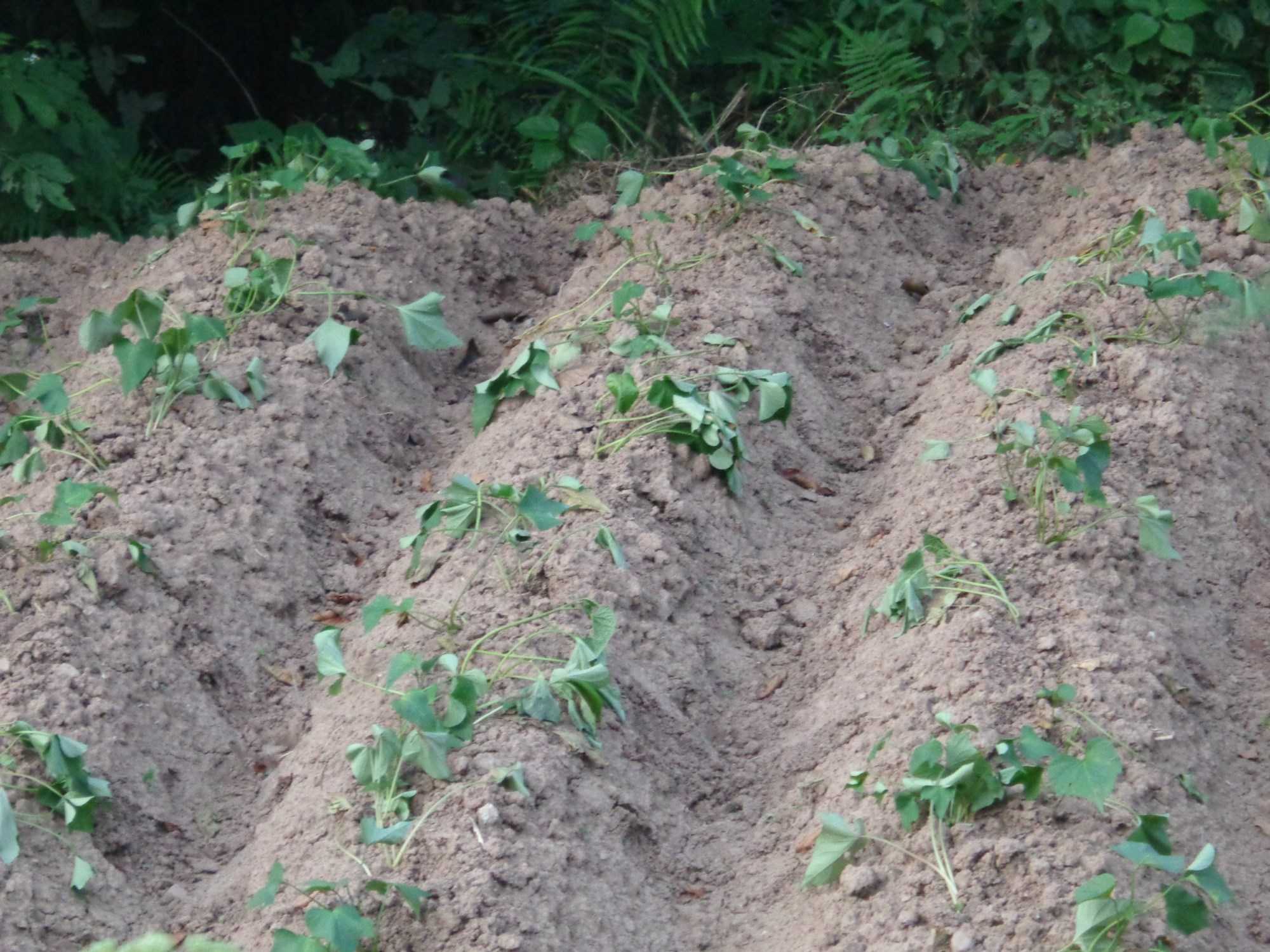 把剪好的藤条放在地的旁边,用食指和中指向刚垒起的土垒中间向下掏一个小坑,把藤条放进去,然后用双手压紧藤条周围的土壤,连续向上面的方法这样做,很快就会栽完藤条,虽然刚栽完的藤条有点乱,但是过了几天就会长得好好的。其实栽红薯,既简单又好玩,一起来试试吧!