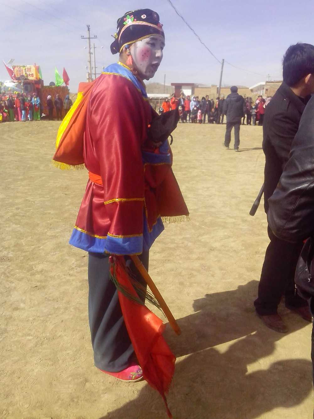 音乐开始前,秧歌队准备完毕,音乐一响起她们就开始跳,她们跳的很整齐,领舞的人一吹哨子,她们就开始跳出各种各样的舞姿,看起来很漂亮.