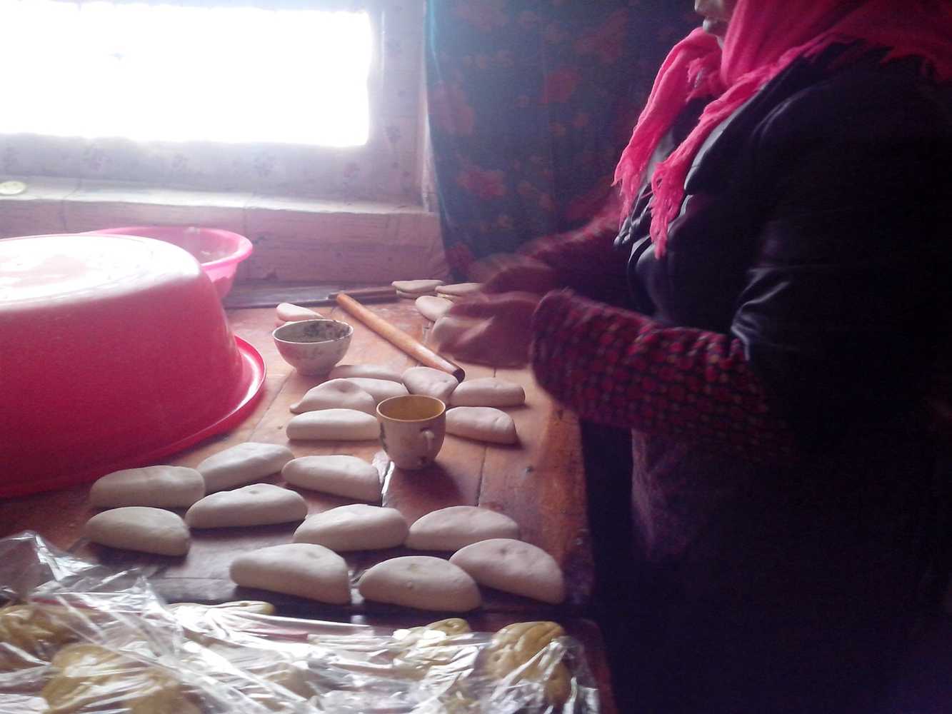 妈妈把发酵好的面揉好后,便用擀杖把面擀成一中约厚1.5厘米,半径约5.5厘米的厚面饼,然后在中间涂上绿色的调料,再把面饼对折,在上面涂上姜黄就做好了。