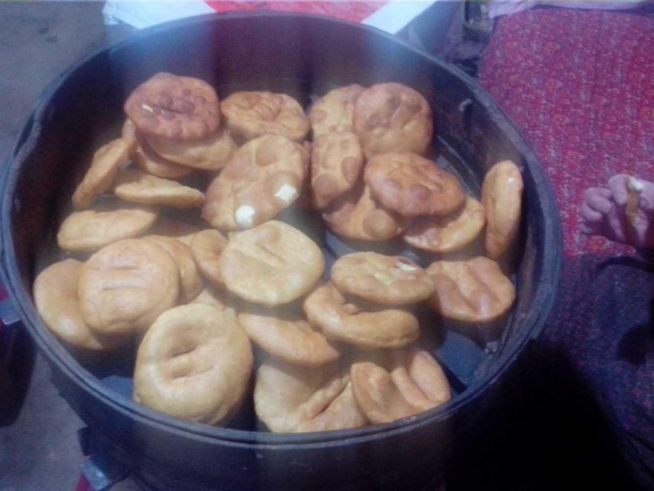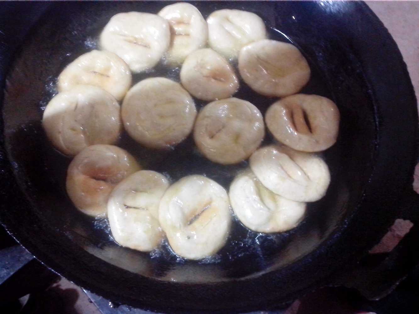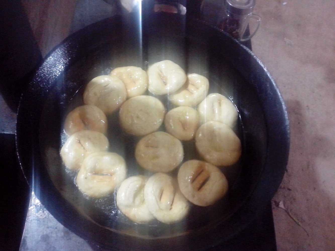 没过多久,油锅里的油热了,爸爸就把油饼放到油锅中,每个面团中间好像压上了一个木头模子,外壳变硬成型后再拿出,这样出锅的油饼中间是凹的。配料虽然简单,但成品外型很诱人,尤其是那个凹面部分,吃起来格外香酥可口。