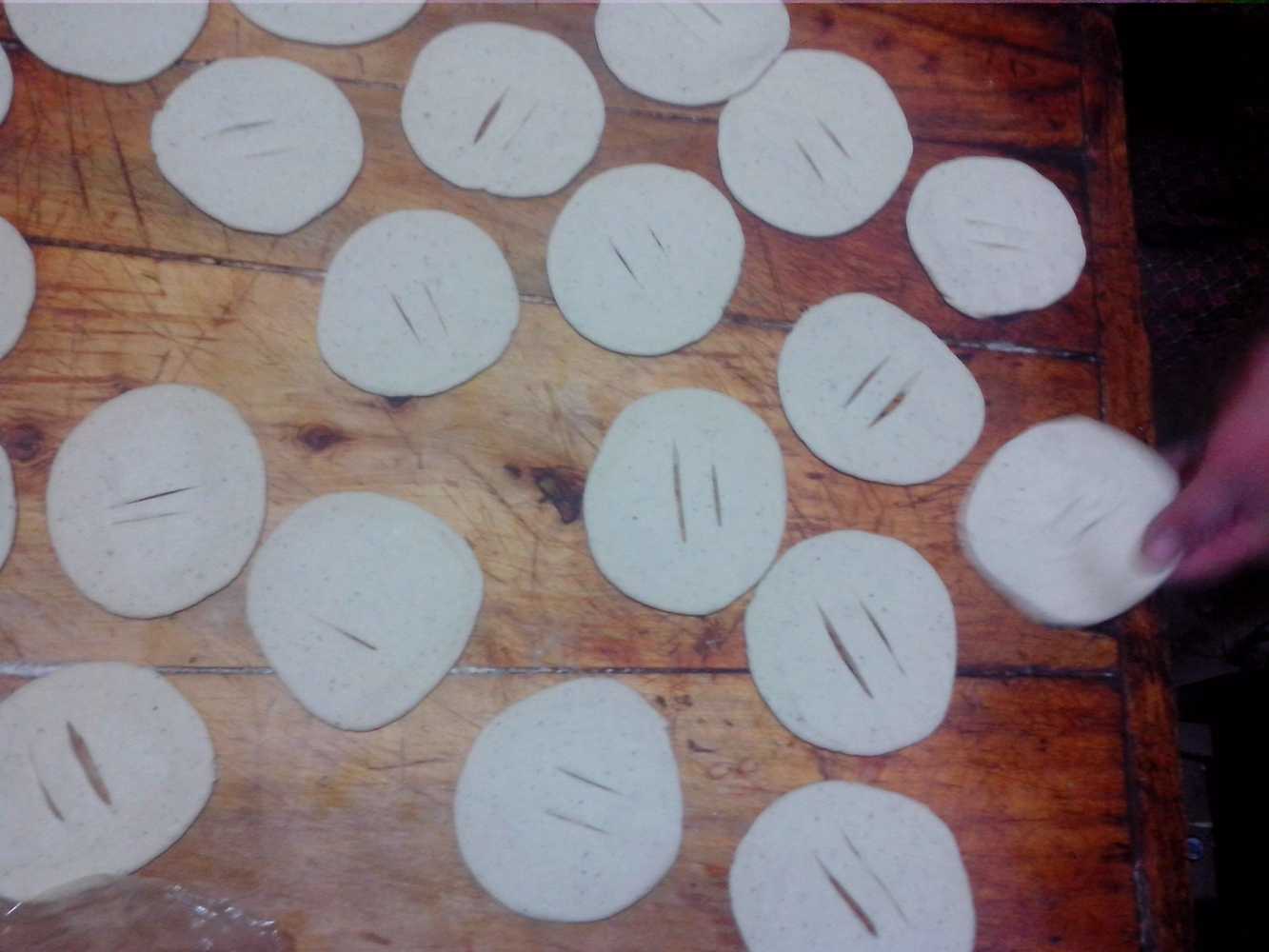 首先,妈妈把面揉均匀后,就把面擀成了厚约1厘米,半径约6厘米的面皮,然后在上面用刀切出两个深深的刀痕,这便是未熟的油饼了。