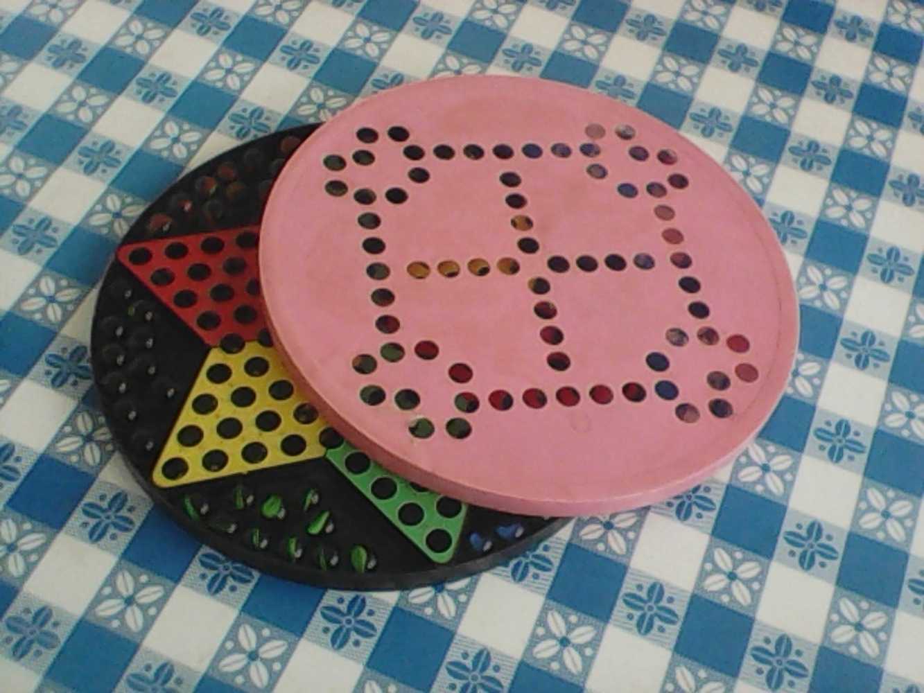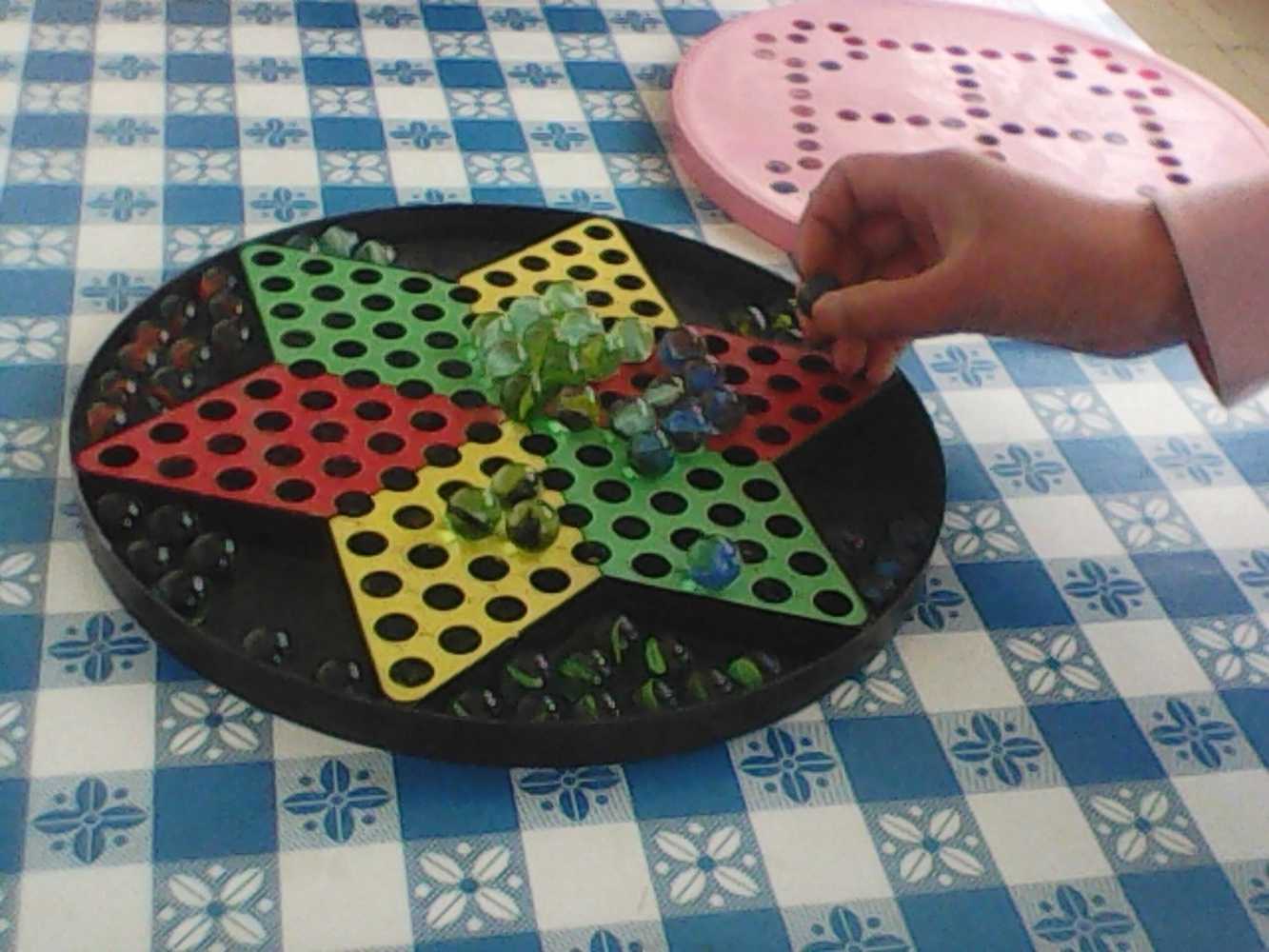 我有一盘跳棋,这盘跳棋有六种不同的玻璃球,有红色,绿色,蓝色,黄色,黑色,银色。