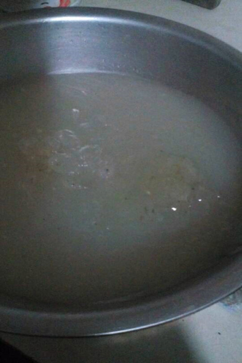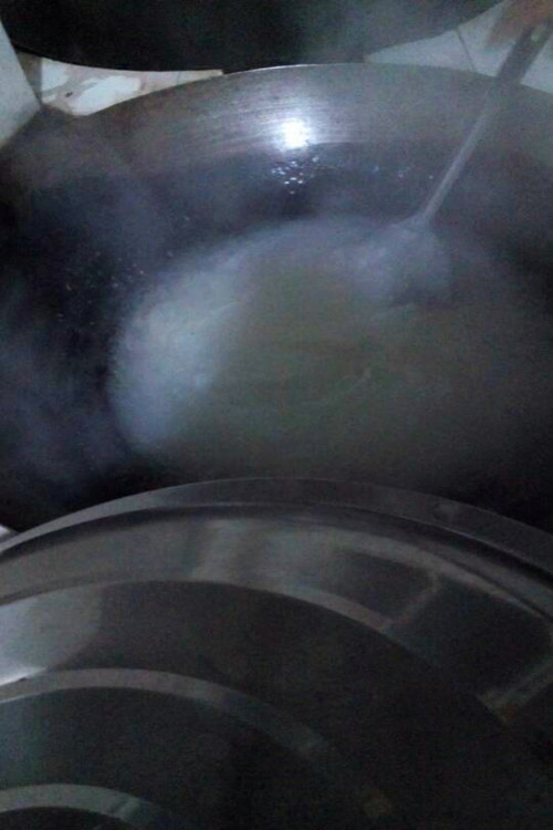 接着,在锅里掺入适量的水大火烧开(沸腾),然后一边向锅里倒入水发开的芡粉,一边用锅铲不停地搅拌,搅到锅里粉汤吐泡泡,粉的颜色变清时说明粉煮熟了,就用一大铁盆把锅里的盛起来,放在一旁冷却。冷却之后,它就结成一整块白白嫩嫩的凉粉了,不过这需要时间,有句话说得好"心急吃不了热豆腐"嘛,所以千万不要着急哦!要耐心等待。当然,为了让凉粉冷得快,也可用凉水加速降温。