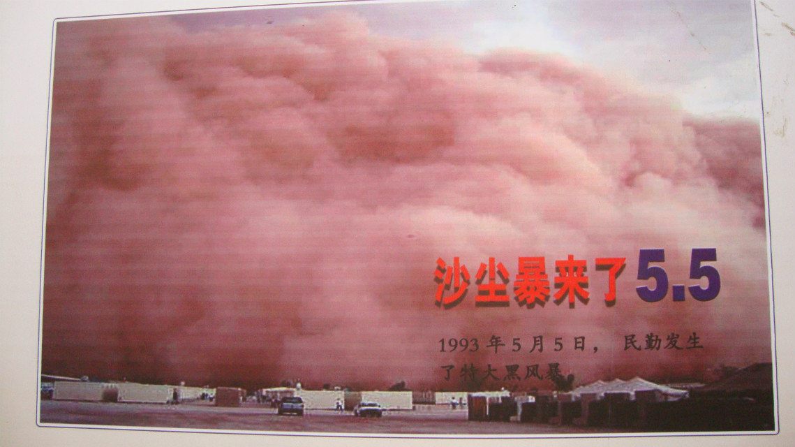 在民勤的历史上,沙尘暴越来越严重。最可怕的一次发生在90年代,被人们称作"黑风暴"。沙尘暴袭来时,霎间风沙弥漫了整个民勤县,空气中弥漫着呛鼻的沙土,坐在家里也只能戴着口罩活动。持续时间达三个小时,有的绵羊也被大风吹丢了。