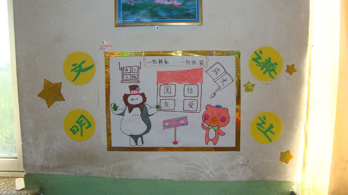 再往后看还有一块小天地,那就是就是黑板报了,上面画了一些关于环保的画,也贴了一些手抄报。黑板报上面写着:"团结、勤奋、文明、守纪",这是校风。我们教室经过我们收拾焕然一新了,我爱我们的教室!