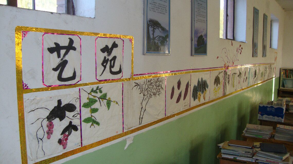 教室的侧面墙上是艺术天地,主要是富有情趣的艺术画,这让教室的后方显得生机勃勃。看吧,有花鸟画,也有山水画,还有的是水彩画和蜡笔画。它们内容丰富、相映成趣,让我们从中吸收营养,提高了我们的艺术修养。