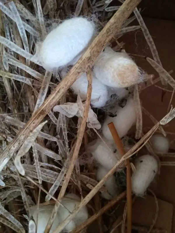 忽然有一天,我发现蚕不愿意吃桑叶了,它们用后部分身体支撑着,把头和上半部身体竖起来,好像在寻找什么。然后,我发现它们嘴里吐出了细细的丝,一根、二根、三根、、、、、、,无数根丝把它慢慢包住,直到用丝包到看不见为止。这是一个个椭圆形的蚕茧附在盒子里。 看着那一个个的蚕茧,我体会到养蚕的快乐,更体会到那句诗句——春蚕到死丝方尽。
