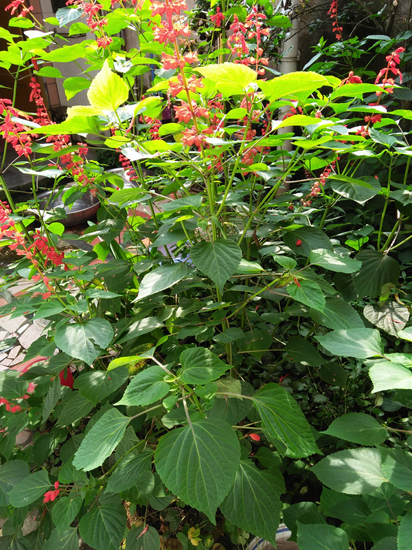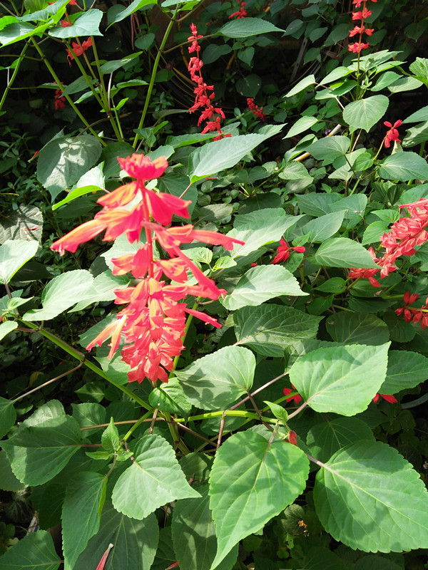 我欢蹦乱跳地走过去一看。"啊!"我惊叫了一声。这到底是花还是树呀!说它是花吧,却看不到它的花瓣。说它是树吧,可绿叶上面显然是红艳艳的。我仔细观看着它的"花蕊",浅绿色的"花萼"紧紧地裹着一点点红的,仿佛一只刚伸出头来探看世界的螳螂。奇怪了!同样是叶子,可为什么下面的是绿色而上面的却是红色呢?我正在纳闷时,阿姨告诉我:"这叫"一万年红"。 可是为什么叫"万年红"呢?原来一年四季都在开花,只要你家种的有,几乎每天都可以看到那鲜红的花儿。