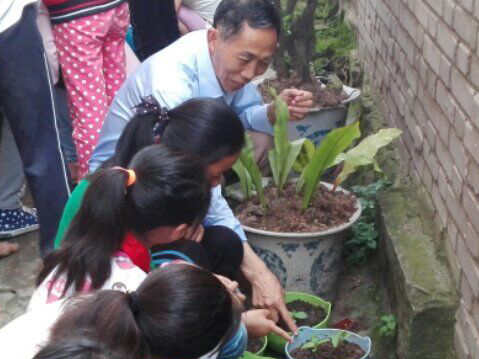 我们全校同学的花盆都是不同颜色的,我们是小的,王老师也有许多大,看着那些被老师呵护长大的植物,我觉得自己和它们一样也在长辈的呵护下成长。 王老师总是细心的在旁边指导,总是听见他耐心的话:"把土揉松一点,多放点土,把它填平......"。经过几天的时间,终于全校同学都种好了自己那盆"小孩子"。