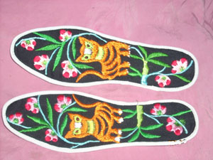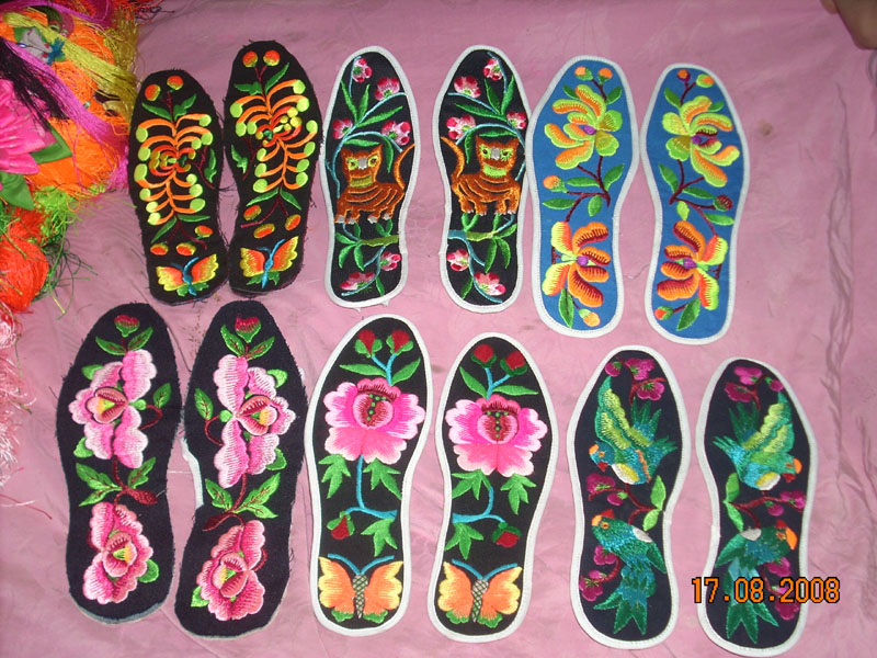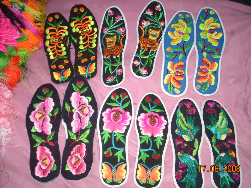 我大致请教了妈妈,鞋垫如何做:妈妈很耐心的告诉了我。做鞋垫倒是很容易,就是按照人的脚的大小量上,然后用布匹剪上人的脚印,用线缝上。但是在鞋垫上扎花就比较困难,首先用在鞋垫上画上要做的图案之后按照图案的颜色配线。最后要用针线将图案绣上。