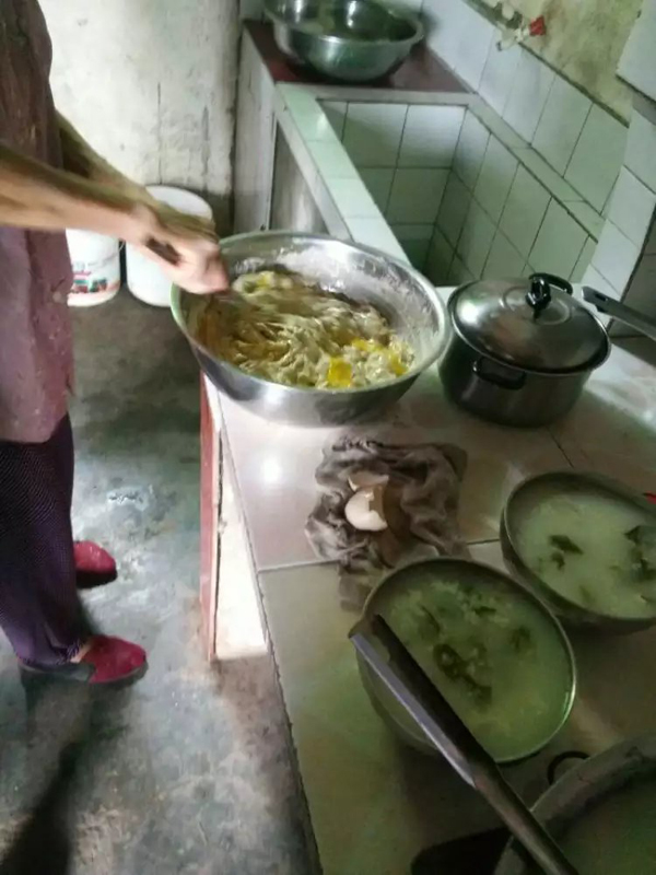 家里的面是自己家磨得,鸡蛋也是自己家的鸡下的。做法想想也是再简单不过,把面粉加上水(一碗面兑两到三碗水)然后加上鸡蛋当然如果光吃面就没有意思了,你得加上一些菜比如茄子肉啊其实也是挺好配料,个人比较喜欢梨子。