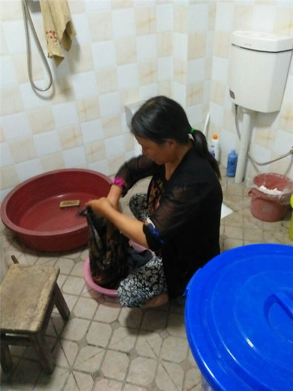 瞧,母亲在洗衣服。母亲常去采茶,所以常常有衣服要洗。任何污渍在母亲双手用力下,污渍都一扫而光了。