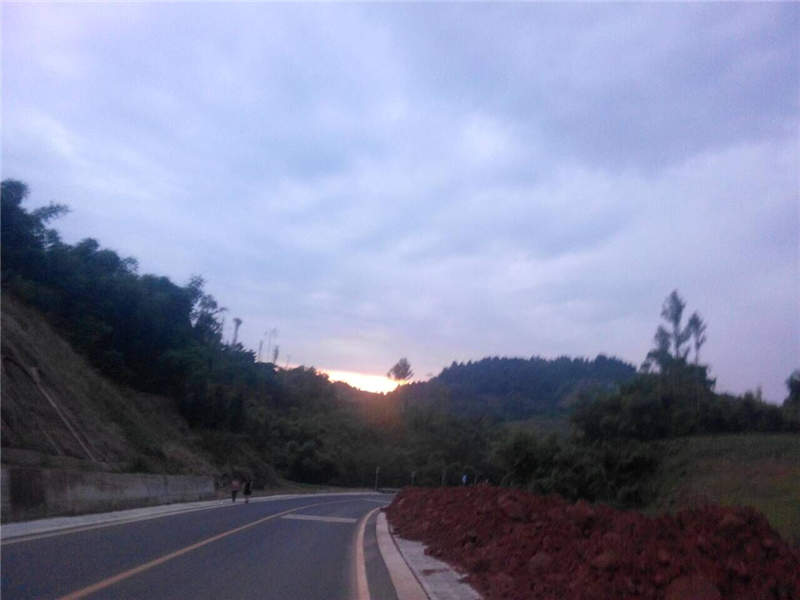 我出家门时已是黄昏,路上的行人也渐渐多了起来,我不知不觉地来到了天桥,从这里刚好能看到对面夕阳的余晖渐渐地隐没在群山之中,我希望能看见更多的红晕,于是奋力往前路。