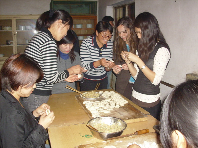 看这些外国朋友在和我校的教师在一起包饺子,他们并不是天生就会,所以便向各位教师请教。老师教得仔细,外国朋友学得也很认真,很快就学会了怎样去包饺子,但这还不够,熟能生巧,他们必须要包许多饺子才可以包好饺子,把饺子包得好看。