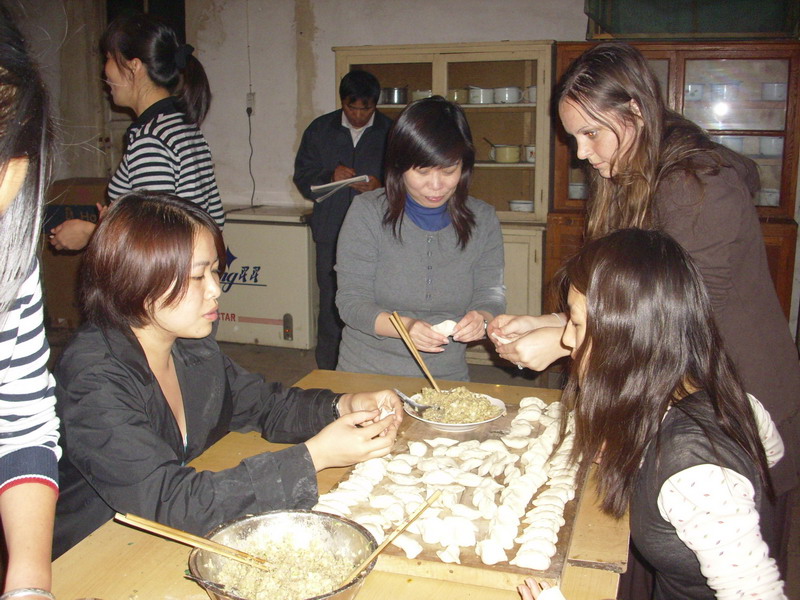 前些天我校来了几位外国朋友,他们十分喜欢中国的食物,尤其对饺子情有独钟。所以我校的教师便陪他们包饺子、吃饺子。