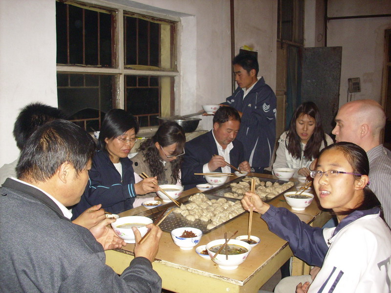 他们的劳动成果终于好了,满盘的饺子看得让人口水都流了下来,再看看桌子上的各种调味品,有醋、酱油、蒜末、油泼辣子……这些调味品让满桌的饺子更加可口。外国朋友和我校的教师开始用餐了……