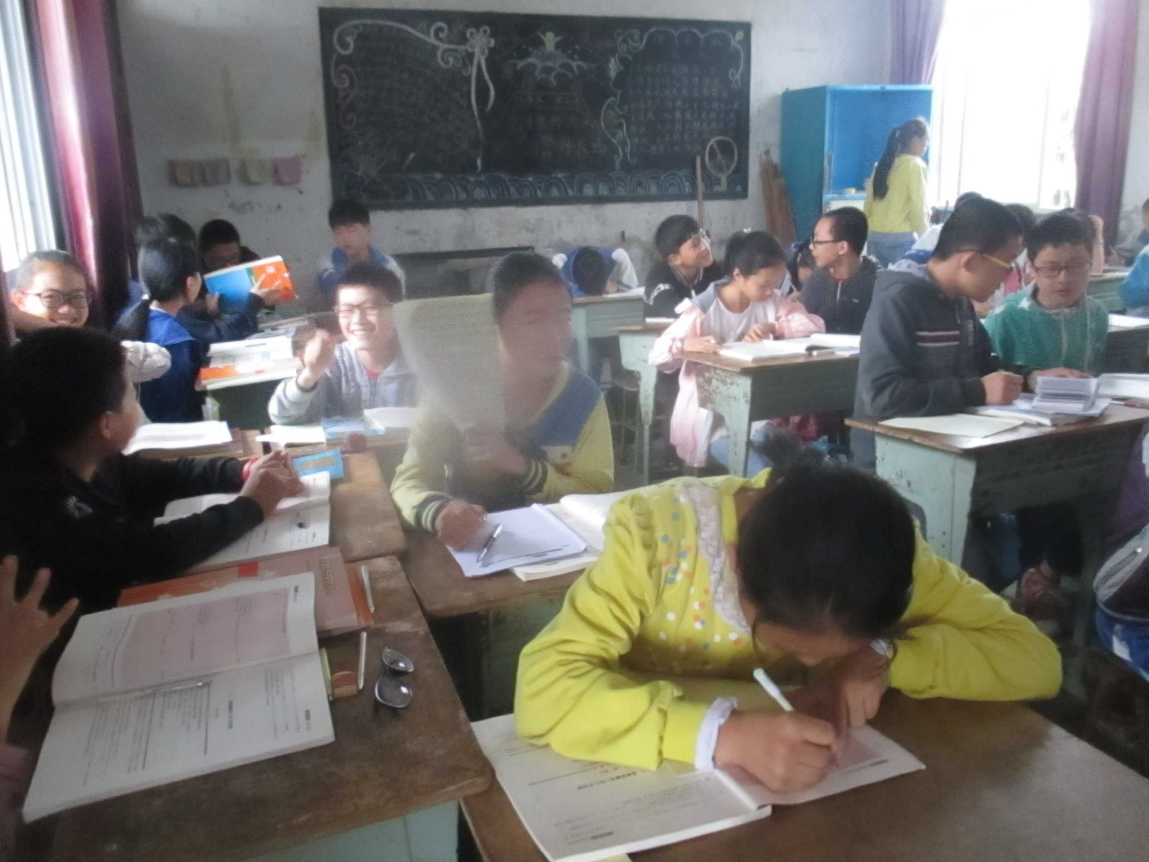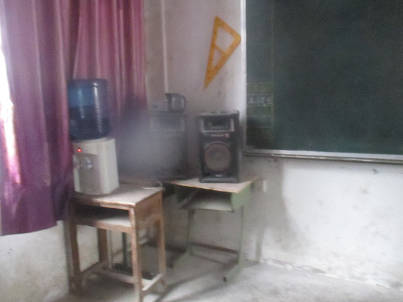 初来这个班,首先让我看到的是:这个班与我们以前的那个班不一样是分小组学习的,分为七个小组,每个小组6个人,我来的时候就被分到了第二组。讲台前面放着两个音箱。这个班的设施设备没有我们以前班的齐全。班上的桌子板凳也没有换,还是旧的。