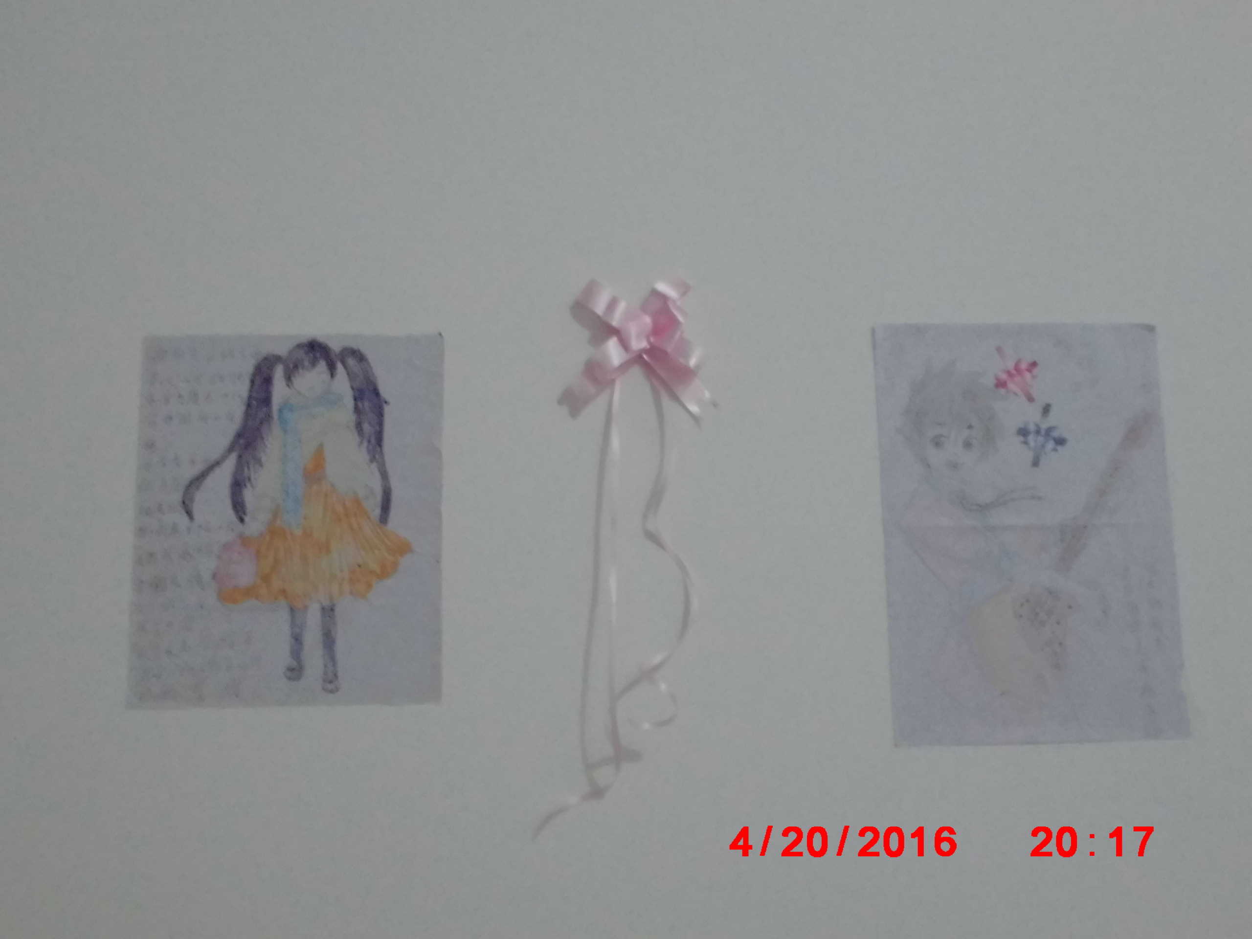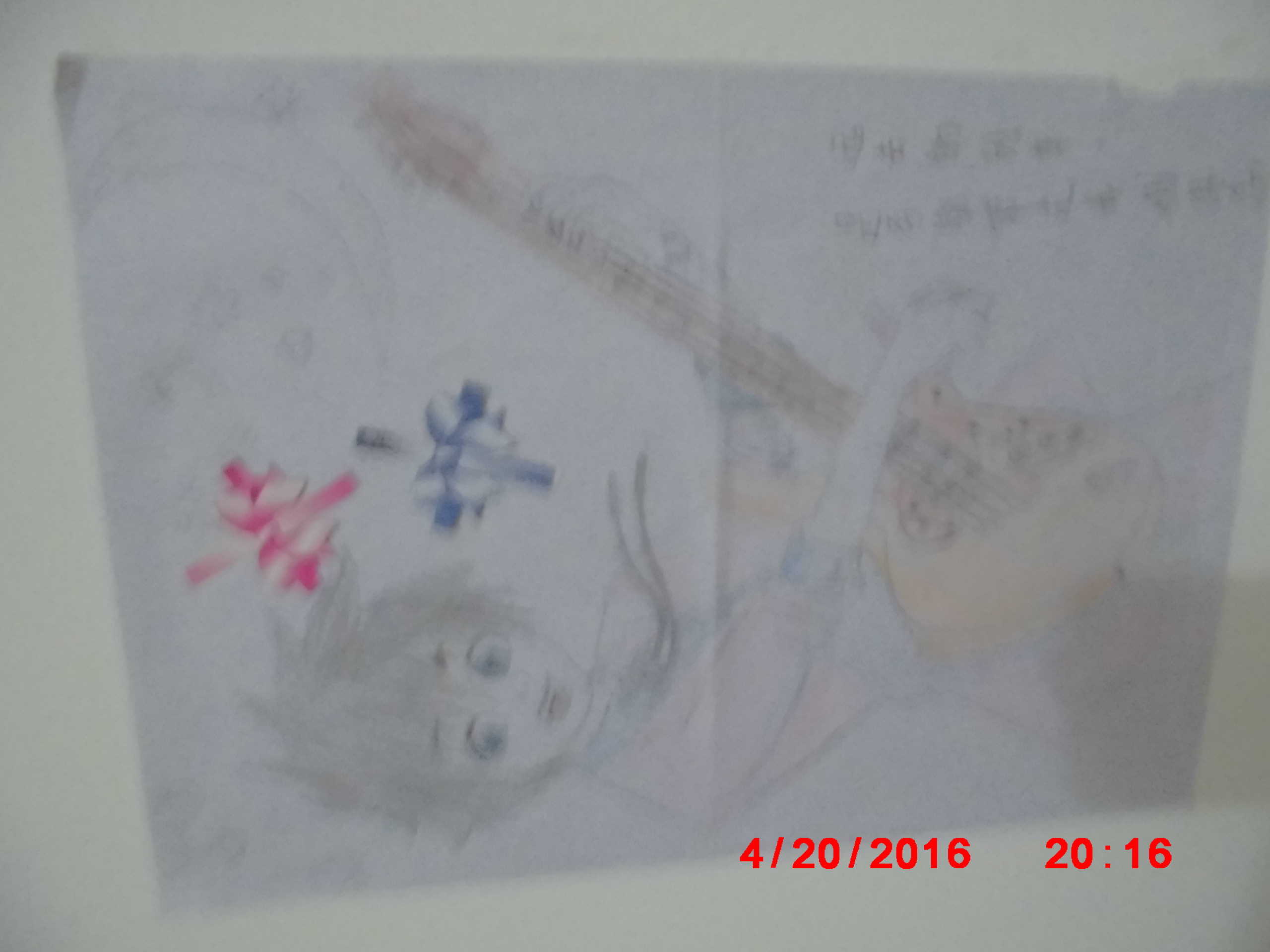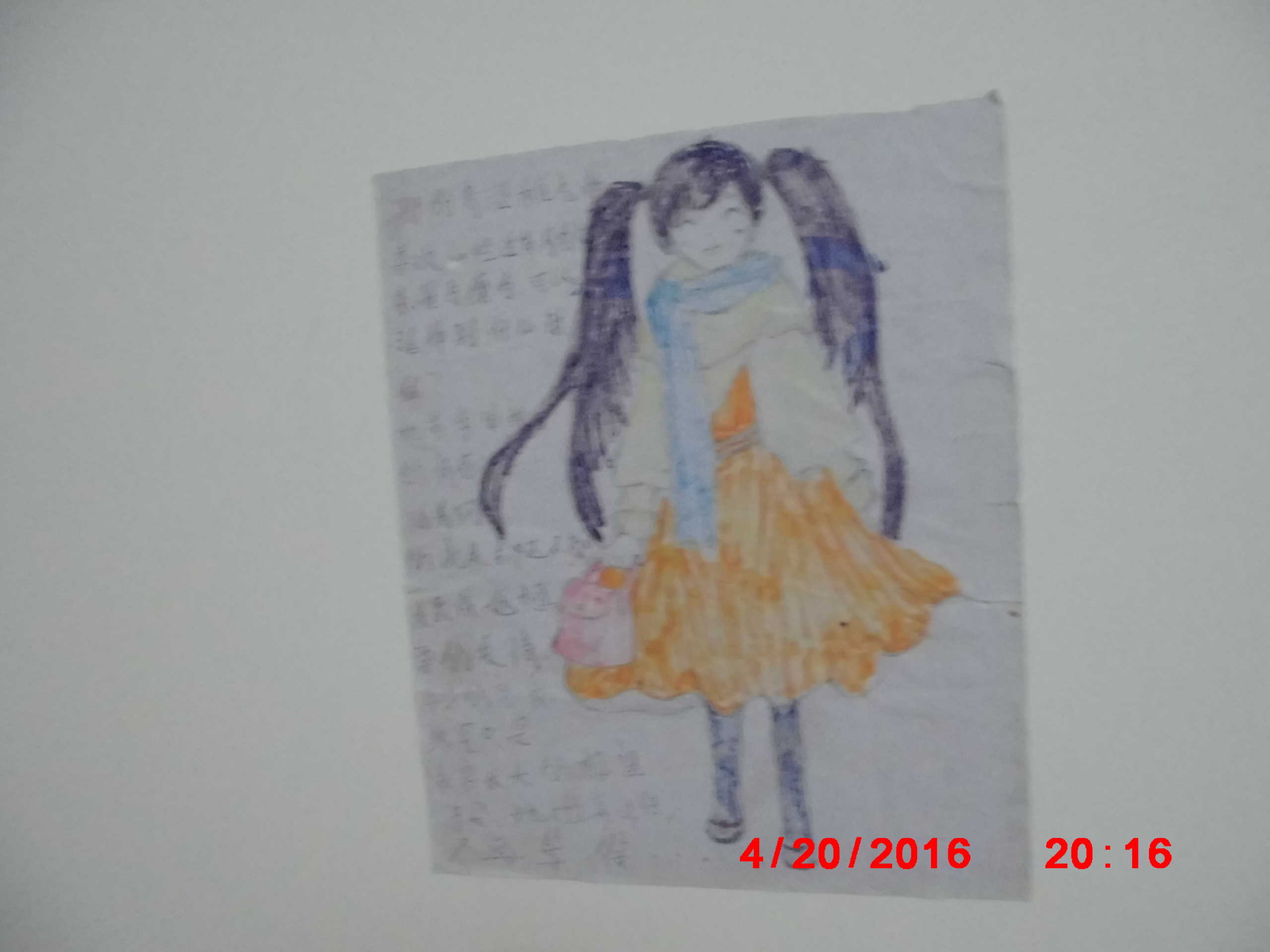 一次无意中,我看见了一张她画的美少女,蓝蓝的头发,橙色的裙子,又长又细的腿,她把头发画的淋漓尽致,如像在空中飞这一般,脸上带着微笑,甜甜的笑容带着儿童的稚气,很是不断很荣幸,她把那张画送给了我!