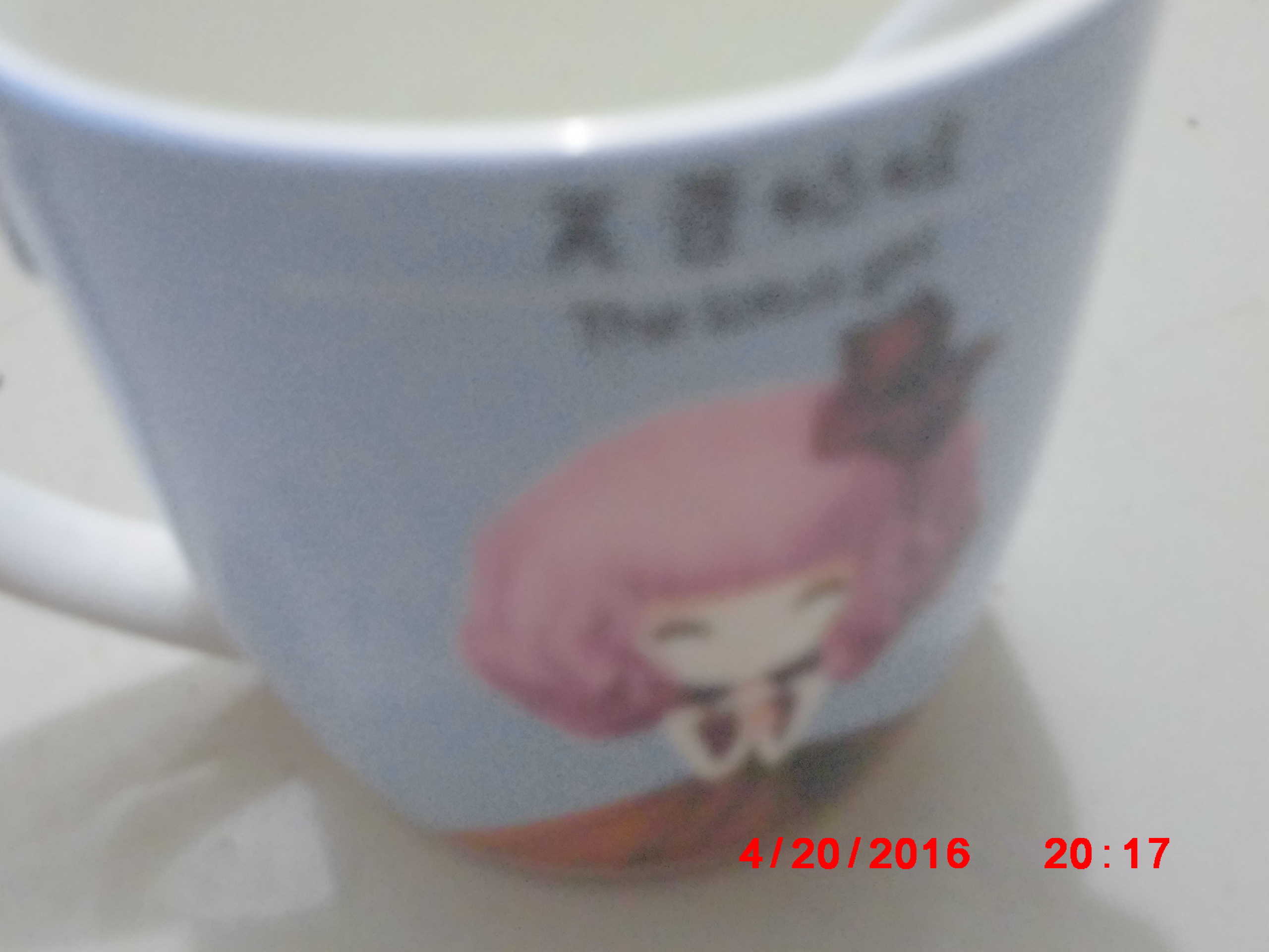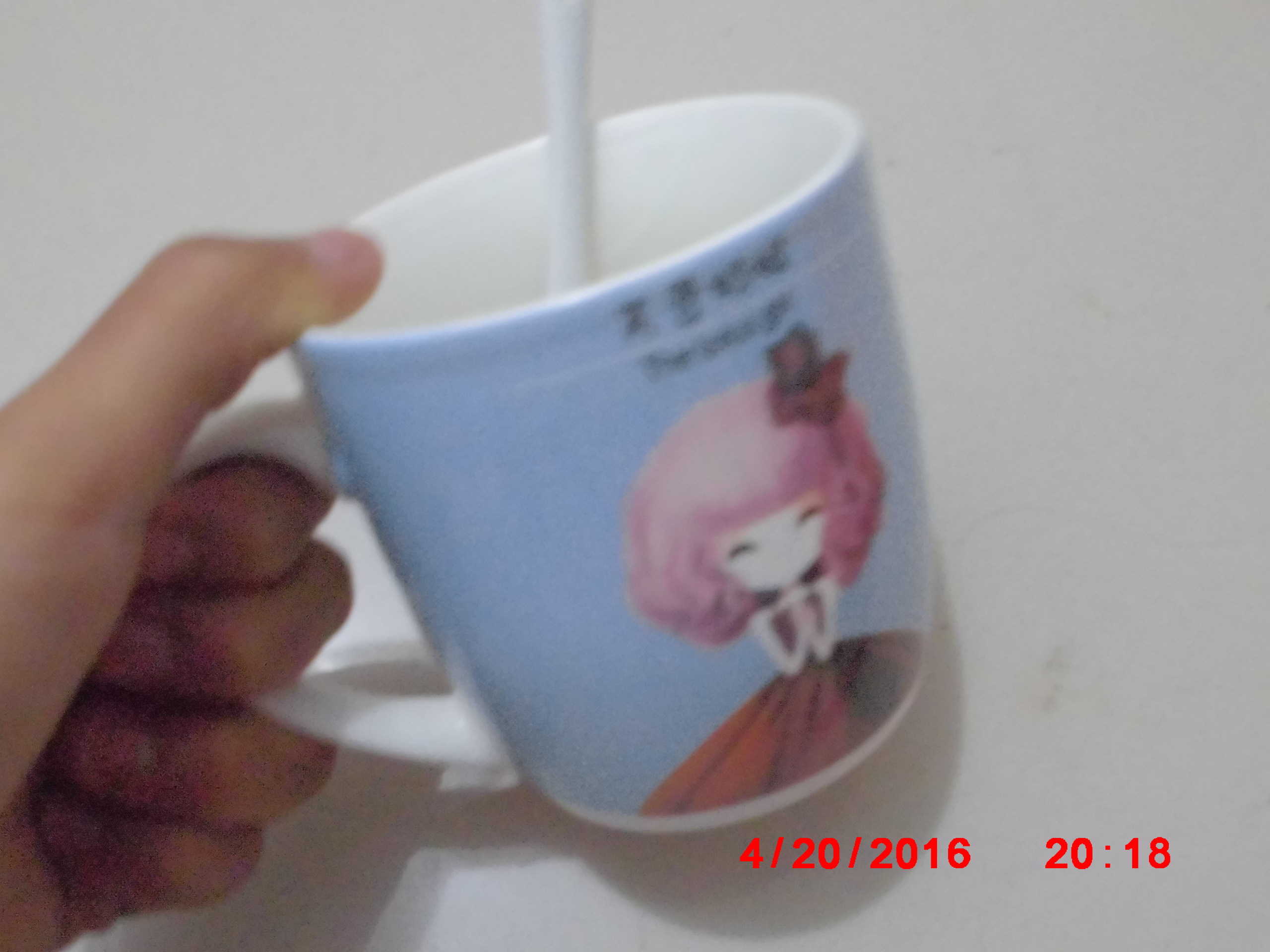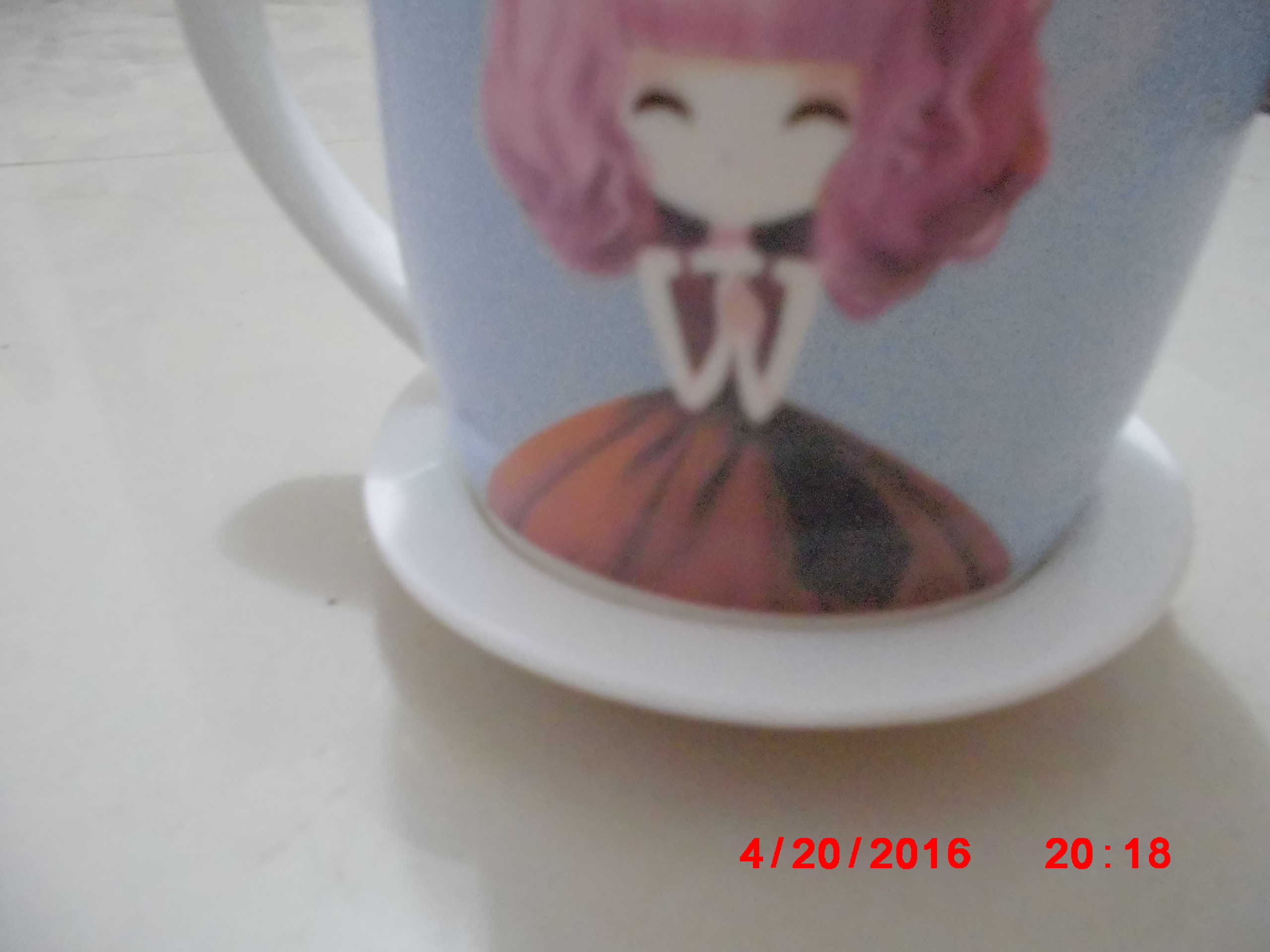 它的杯面还有一个十分漂亮的女孩,这个女孩是我很喜欢的一个卡通人物,大部分是蓝色的,还有粉色、白色、绿色、褐色等颜色交错分布,这样构图很美.我每次用它喝水时,看着它的构图,心情会很好。也是多喝一些水。
