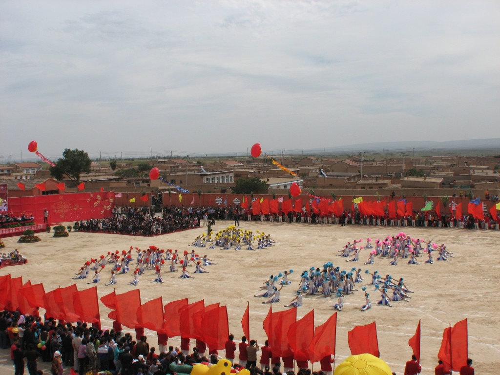 随着音乐的变换,我们手拿四种颜色的四队要变换成四朵鲜花,并要显示开、合的动作。花朵共分三层,为了能显示出层次感,最外面一层要坐在地,第二层半蹲在地,最里面一层(花心)站立起来,我们一层一层做着各自的动作,但要注意和整个花朵的配合,也要注意和四朵花的配合,这样看起来就好了。我是四朵花中粉色花朵中的一员,很荣幸呀。