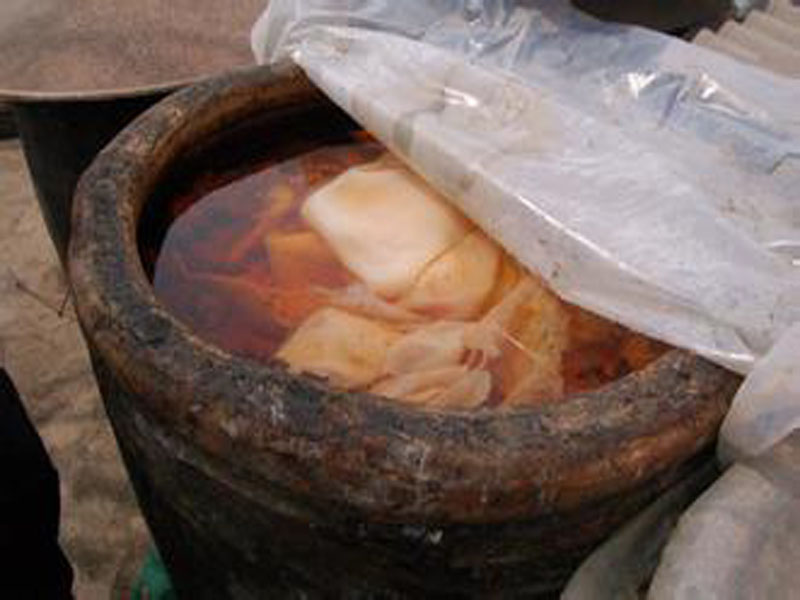 缸和竹楼消毒晾干后用棉纱在竹楼底衬上1~2 层,再用塑料布在竹楼内的周围衬上一层,就可以上料了,上完料后用棉纱盖在上面,最后用防尘罩把整个缸罩上。要放在无污染无蚊虫的地方。经过6-9个月自然发酵后,缸里面淋出的柿子水就是柿子醋原液。这两个月之内不要动它,等能闻到有醋的酸味时,把竹楼拿下,看看缸内柿子水的上面有没有一层乳白色的半透明的东西(醋衣),如果有证明成功了,这是前期发酵。但不会太酸,有甜味。颜色就像红葡萄酒一样透明。