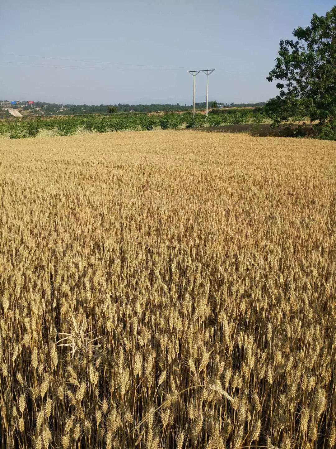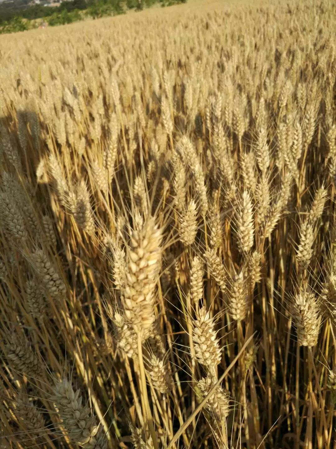 在这蓝色的水泥路上和金黄色之中,有着碧绿色的小麦。