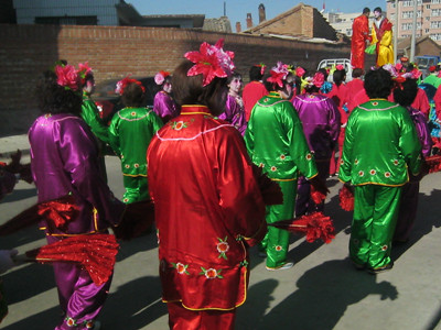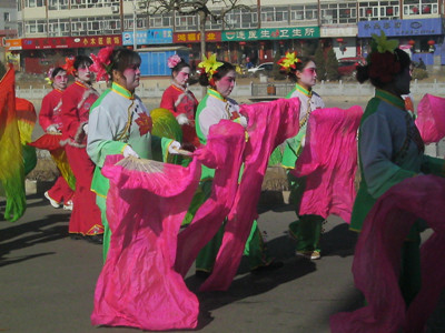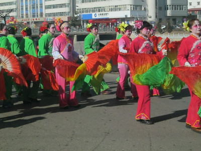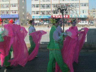 在正月十二的时候,参加大秧歌的人就开始准备,他们抓紧排练着。到了正月十五,也就是元宵节的时候,大秧歌开始扭起来了,街上非常热闹。扭秧歌的人排两三队,他们画着大花脸,穿着彩衣,手中舞着五彩缤纷的扇子,扭得很好看。虽然秧歌队里大多都是中老年人,但是他们的脚步轻盈,动作优美协调,让一些在旁边看着的年轻人也加入了这条"彩色的长龙"。在扭秧歌的后面,还有几个身强力壮的年轻人穿着古装,踩着高跷,摇摇晃晃地走着,别看他们摇摇晃晃的,每一步都走得很稳,还不会摔倒。在他们的后面,还有一群小孩子们最喜欢的"大头娃娃"、"孙悟空"、"猪八戒"……这样的场景直至深夜才结束,为节日增添了无限的乐趣。