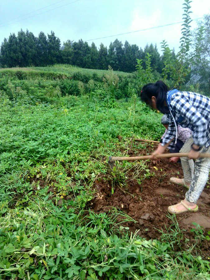 下午的时候,才刚刚下了一场雨。整片大地都浸泡在水雾之中,空气变得清新且湿润起来,又很凉爽。于是我们决定到二幺家的土地上去摘花生。