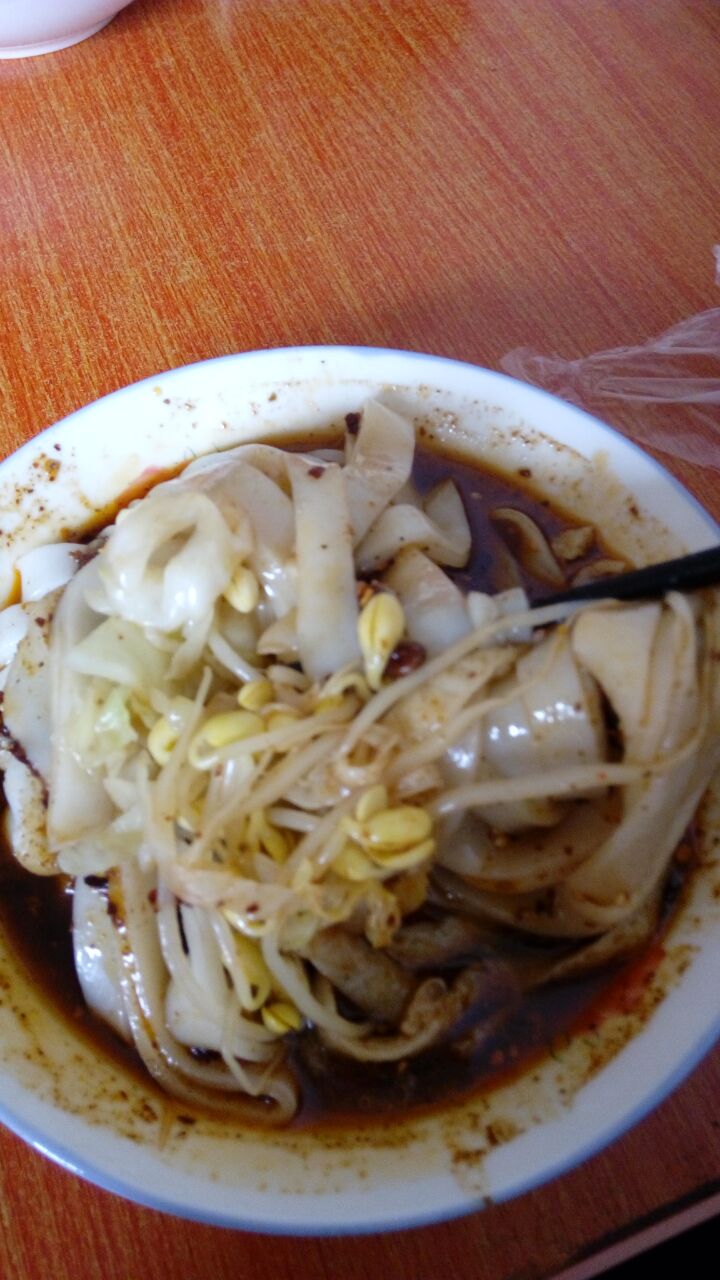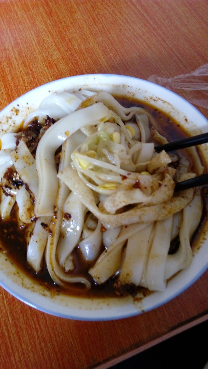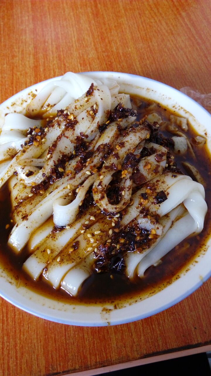 吃面皮不放辣椒是尝不出什么滋味的。讲究一点的选用的都是上好的尖椒,细细地磨成面粉状,加进芝麻,再溅上热油,远远地闻到就让人胃口大开。于是你只好坐了下来,谁让肠胃那么淘气呢?只是不知不觉间就吃下了一碗,有点象猪八戒吃人参果一样,只知道好吃,只知道吃,倒忘了品味,你就只好再来一碗,细细品味。只是终究有些说不出个所以然来,辣也不是,酸也不是,麻也不是,只觉得心里热乎乎的,肠胃舒畅,口舌生香,油而不腻,清爽暖心,最好再喝上一碗菜豆腐,就象是喝咖啡要加伴侣,不一刻,你就头顶脚心都冒着热气,也面若桃花了。怪不得汉中的女孩子平时看上去水灵灵,温润润,斯斯文文的,可吃起面皮来却也颇有些气吞山河的架势的。原以为小吃终归是小吃,是上不了席面的,谁知有回在一位朋友的婚庆豪宴上竟意外地看到了面皮,它被围在一圈油光光的精肉之中,上面盖着一大片生菜叶,四周点缀着不少的樱桃、莲子之类,一时间,色香味竟被它占齐了,那一大盘子端上来没两分钟,一人两筷子也就一扫而光。
