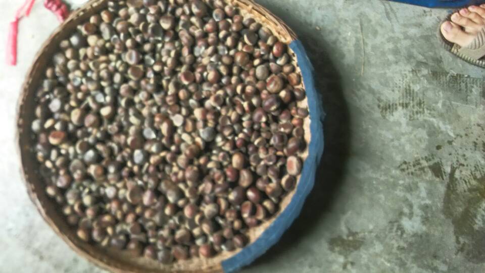 10月份人们开始上山捡板栗,大家都会捡很多。有的用来吃有的用来卖。板栗的外皮是棕褐色,剥开外壳,里面还有一层棕色的薄膜,再剥过一层就是淡黄色的板栗了。可以生吃,咬上一口清脆爽口。还可以在炉子上烤着吃,烤出来的板栗又甜又绵,更加好吃。最常见的是炒着吃,在锅里炒上一会儿就可以吃了,不需要放任何调料,同样美味。