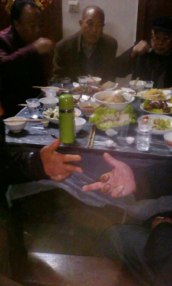 喝酒 菜上齐了,接下来就是喝酒了。喝酒是整个坐席中必不可少的一个环节。 在菜上齐之后,上席人员按逆时针方向,把酒壶传向每个人,待每个人把酒盅倒满之后,共饮三杯酒,才可以动筷子。这三杯酒代表着桃园三结义。如果有人喝不了酒,那么他就起一下(端起酒杯,少喝一点) 喝酒途中,常常会有酒令,柞水酒令颇多。有常规拳 蛤蟆拳 老汉拳 打杠子 猜宝等。列如《蛤蟆拳》:划拳的人同时唱前四句:一条蛤蟆四条腿,两只眼睛一张嘴,嘴儿张张要喝水,扑扑腾腾跳下水。接着二人出拳喊数X个X个你喝水(酒),一直划到拳成数为止。在划拳过程中,变化无穷,目的是让通关人多喝酒,赢取对方,输了的人要喝酒,最少喝两盅,多则四盅 六盅 八盅,不能喝单数,每盅有每盅的意思。二盅代表双喜临门 四盅代表四季发财 六盅代表六合同春 八盅代表八进金财......如果酒量好的人,通关人会让人家用酒壶盖喝,酒盅与壶盖的比例通常为4:1,可见柞水人的酒量是多么大的。 酒席上争执不休,但从来都是不急不燥,虽红脸而不翻脸。喝酒就是讲究个搅酒,以显示通关人的酒令 口才 智慧。柞水的酒文化,是搅出来的 划出来的 说出来的。它可以看出你的耐心和毅力。