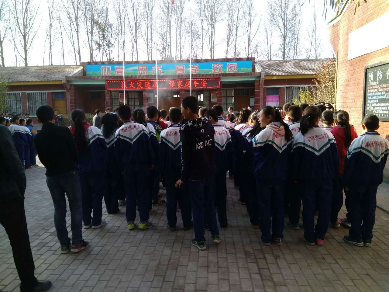 全体师生都集中到旗台前,政教主任运行了防火墙演练的例行讲话。说明了本次防火演练的目的和意义。我们的生命只有一次,让我们珍惜生命,远离火灾,树立防火意识。