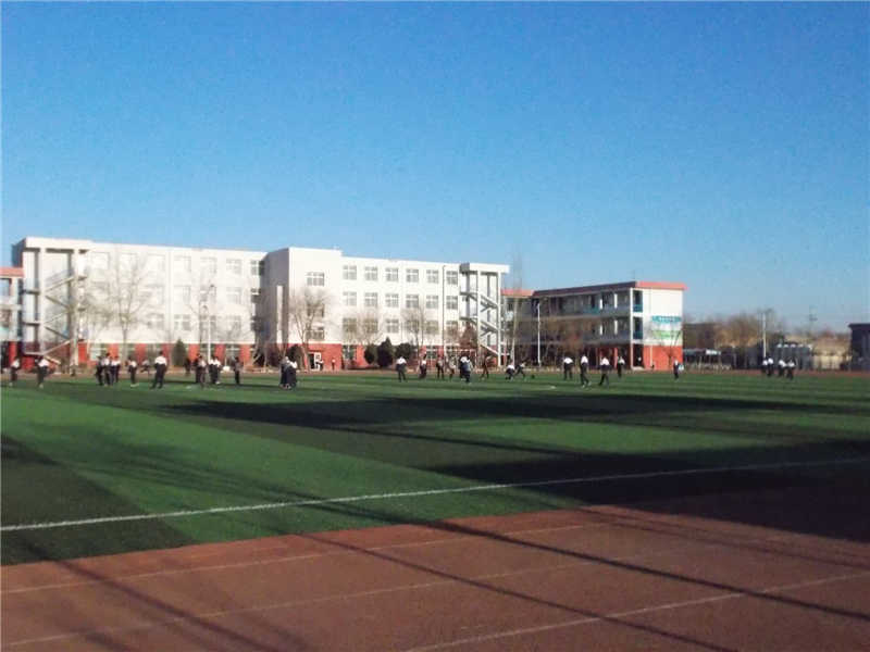 在教学楼的后面是操场,操场很大,铺着深一块浅一块的绿草坪,深红色的跑道围绕着绿色的草坪,显得十分和谐,毫无违和感。每天下课也可以看见许多同学在操场上玩,好不热闹,一片欢声笑语,在操场上荡漾。
