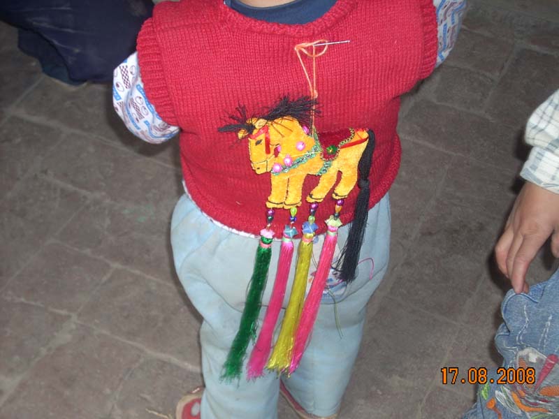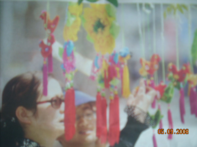 先说说端午节的香包吧!每次到端午节,我们这里的小孩子就会戴上他们妈妈做的香包,一般来说戴的香包和自己的生肖有关,比如你是属老虎的,那么你妈妈就会用五颜六色的线给你做个老虎,戴在你的胸前或背后。如果你还没上小学,那么妈妈会给你做个大的老虎戴在后背,如果你已经上了小学,那么你的香包就比较小,而且挂在胸前。不过像我们上了初中的大孩子,一般不戴。