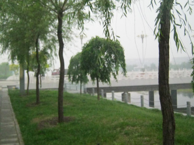 路边的柳树长出了嫩绿的叶子,那长长的柳枝好像姑娘的长辫子,随风摇曳。正所谓"碧玉妆成一树高,万条垂下绿丝绦"呀!