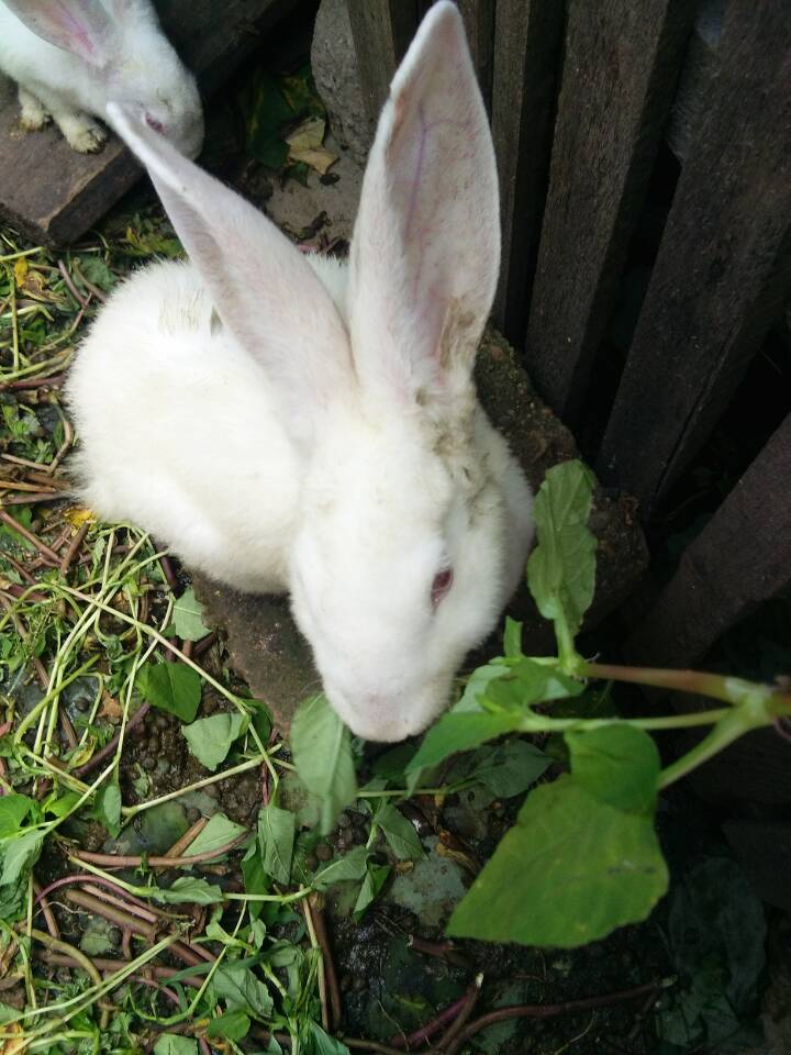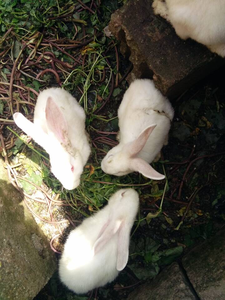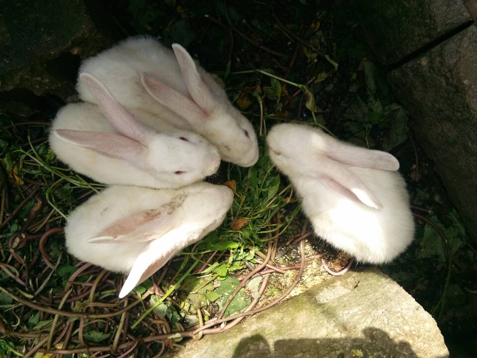 兔子们被关在一个用木板搭成的兔棚里,大约有六七只。有两只大兔子,其他的都是小兔子,它们的毛色很漂亮,有灰色的,有白色的。