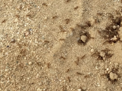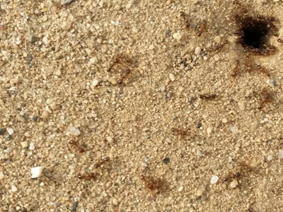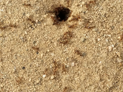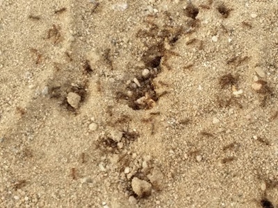 它们转着转着,几只蚂蚁迅速靠拢在一起,好像在商量着怎样把面包运回洞穴的计策。不一会儿,一只稍大一些的蚂蚁带着几只小得像黑点一样的蚂蚁离开了,我猜这几只小蚂蚁是那只大蚂蚁的孩子们吧。它们朝着一个洞穴走去,随后,几只小蚂蚁钻进了洞穴,大蚂蚁站在洞穴外为几只小蚂蚁放哨。一会儿,一群蚂蚁蜂拥而出,这些蚂蚁大约有上百只吧,在大蚂蚁的带领下,奔向那一小块面包。它们聚在面包旁,好像商量着什么。从远处看,这些蚂蚁真像撒在地上的一大片墨水。忽然,几只蚂蚁先把面包一角掀开,钻到面包底下,其他的蚂蚁依次钻到面包下。面包像长了腿似的奔向洞穴门口,蚂蚁们从面包下钻上来,跑到面包后面,将面包推进洞穴后,依次回到洞里。