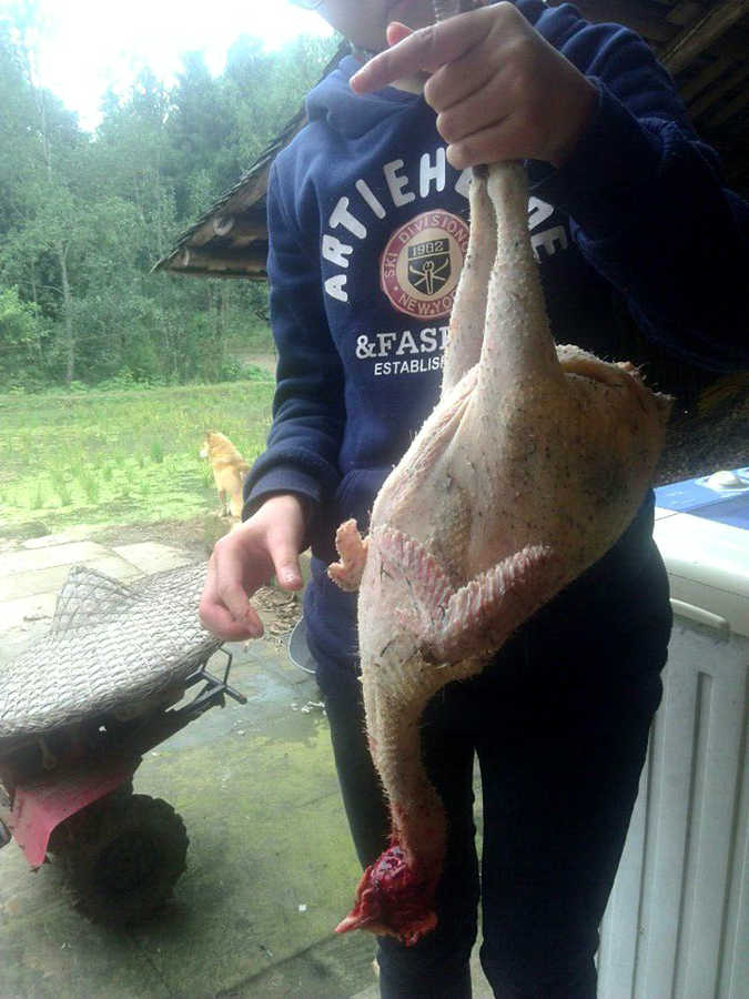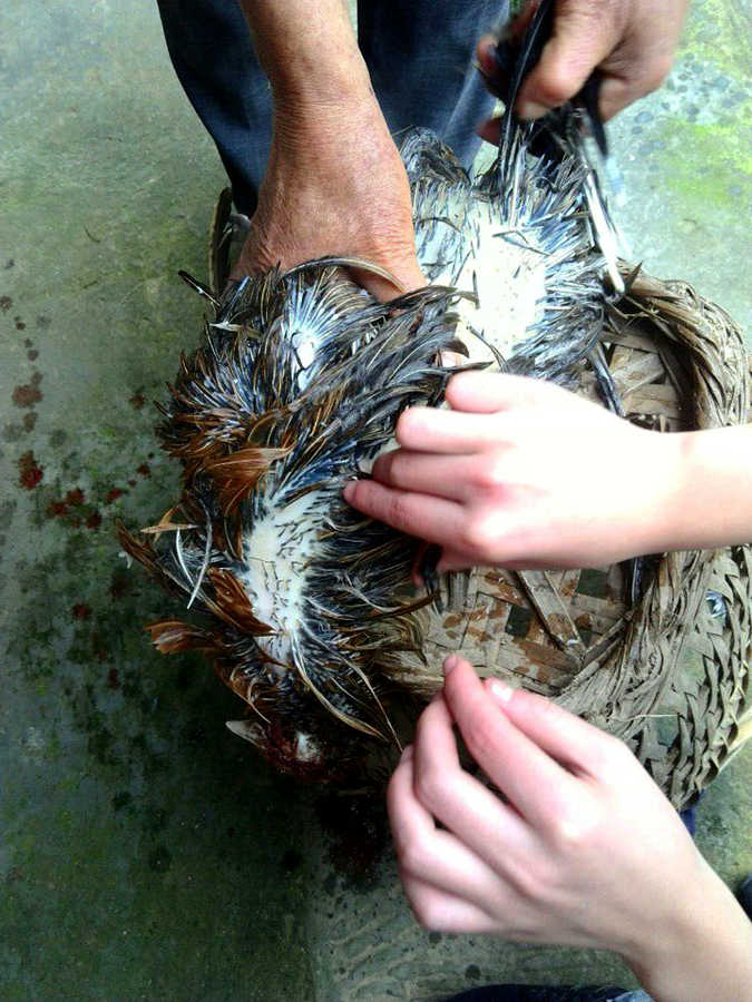 第一个步骤就是把鸡给抹脖子。听起来好残忍。先将鸡脖子上的羽毛撩开,然后又用刀将血管给割破。然后等放完血后,就放入烧沸了的水中。这样鸡的羽毛就会被烫掉,不过,羽毛是那么容易就被消灭的吗?呵呵,那是不可能的。其中,这最大用处就是方便我们拔毛。没错,就是我们!