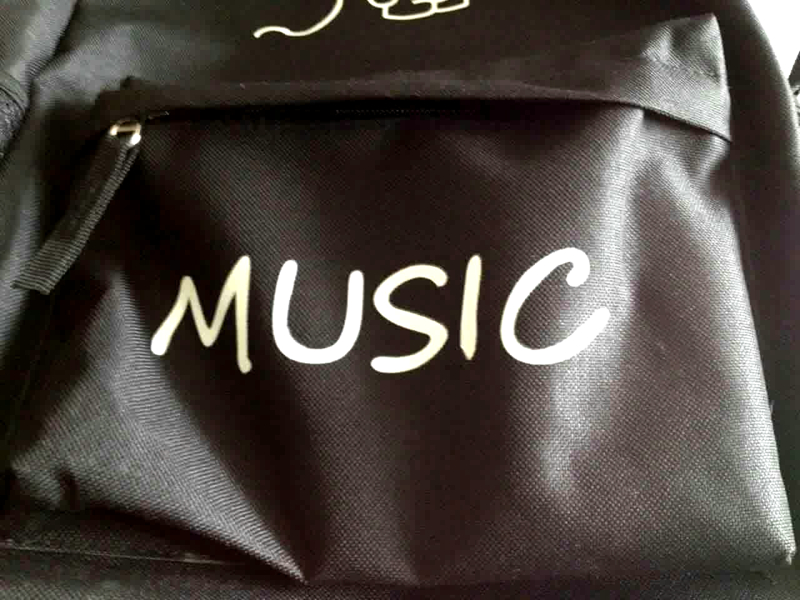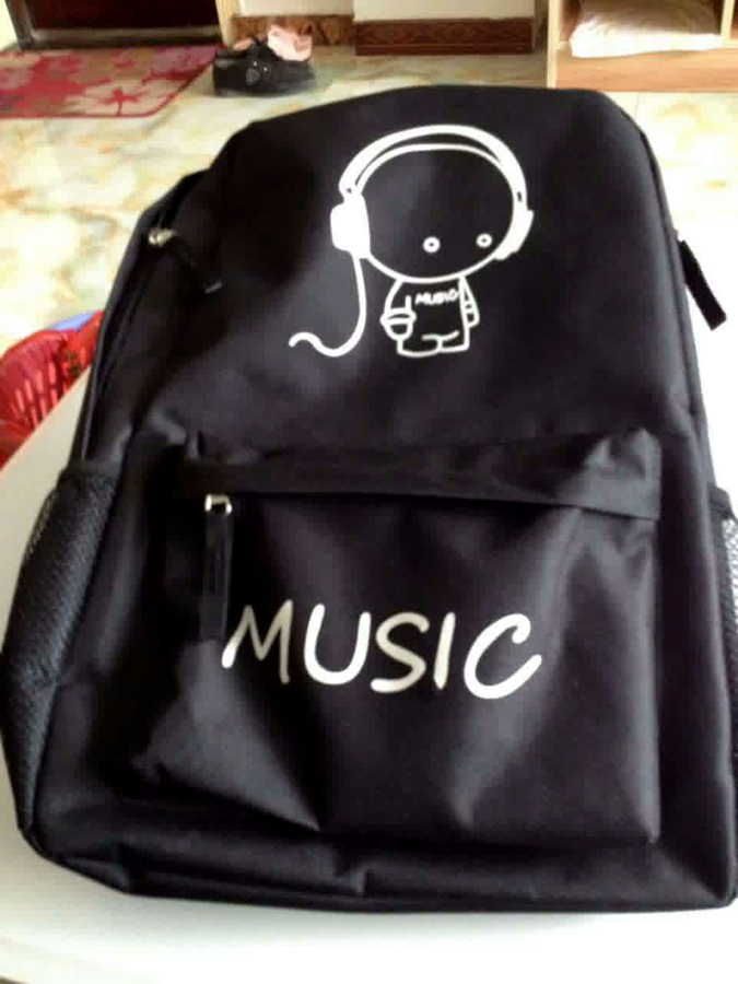 这是个以黑色为主色调的双肩背包,只有印的字母和一些图案才是白色的,这个书包的外层有一个小袋,它只有整个书包的三分之一,上面印有MUSIC字样,在这个小袋里装上放音乐的手机、MP4刚刚好,而且拉链没有露在外面,有一个折痕可以掩盖拉链,这样就可以防备东西被小偷偷走了,设计还真挺人性化的。书包的两侧各有一个网兜,这个可以装雨伞和水瓶,真的是考虑得太周全了。