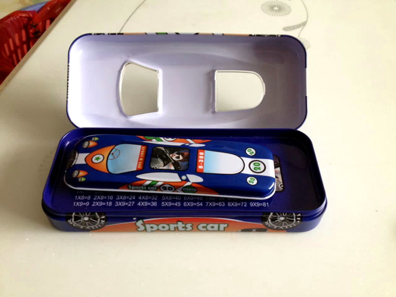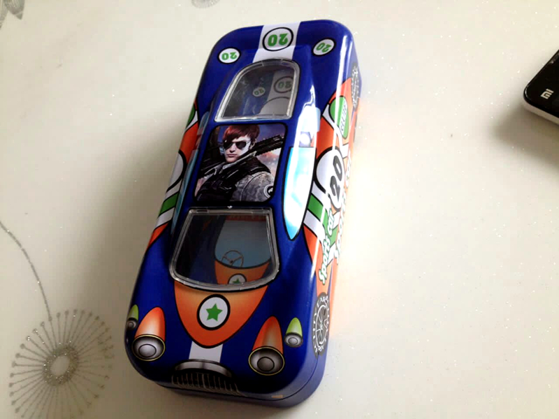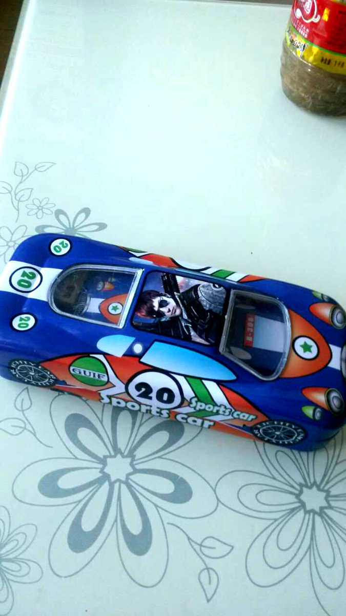 我的文具盒是个长方体,鼓鼓的,像个吃撑了的孩子。它的前面有六个车灯和一个散热的出气孔,侧面还印有SPORTS CAR,不用说大家也能猜出来,我的文具盒就是赛车样式的汽车模型了。但是其中有一点就让我很纳闷了,这样的老爷车也可以当赛车了?而且一般型的汽车排气管都在汽车尾部,而它却印在了侧面的汽车轮子的下面,这也太不专业了吧!