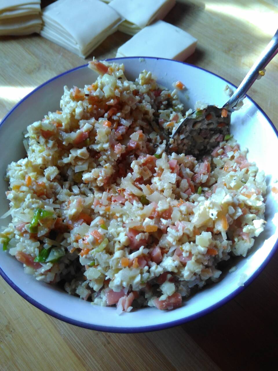 第二步:炒鸡蛋臊子。先将豆腐切成小布丁,接着将鸡蛋打碎搅匀后炒熟。最后将它们放在一起翻炒,再加些佐料就大功告成了。