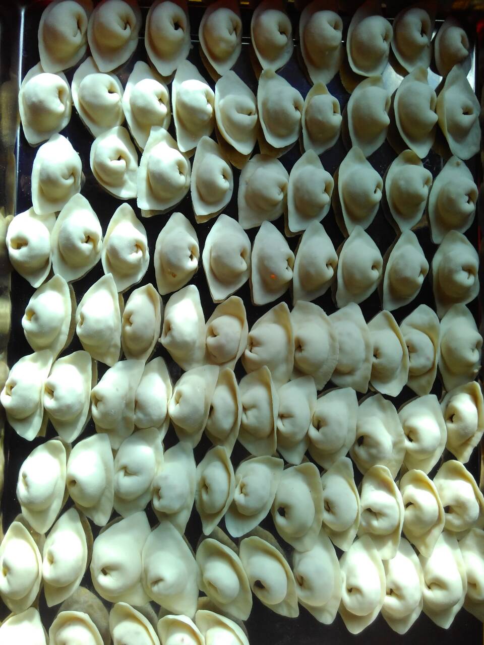 第三步:包饺子。拿出饺子皮,平摊在手上,先报饺子皮上的面粉抹掉。否则,饺子就包不拢。接着,舀一勺馅在饺子皮上,把饺子对折,将四周捏拢,最后卷一圈,就包好了,真像一个金元宝。