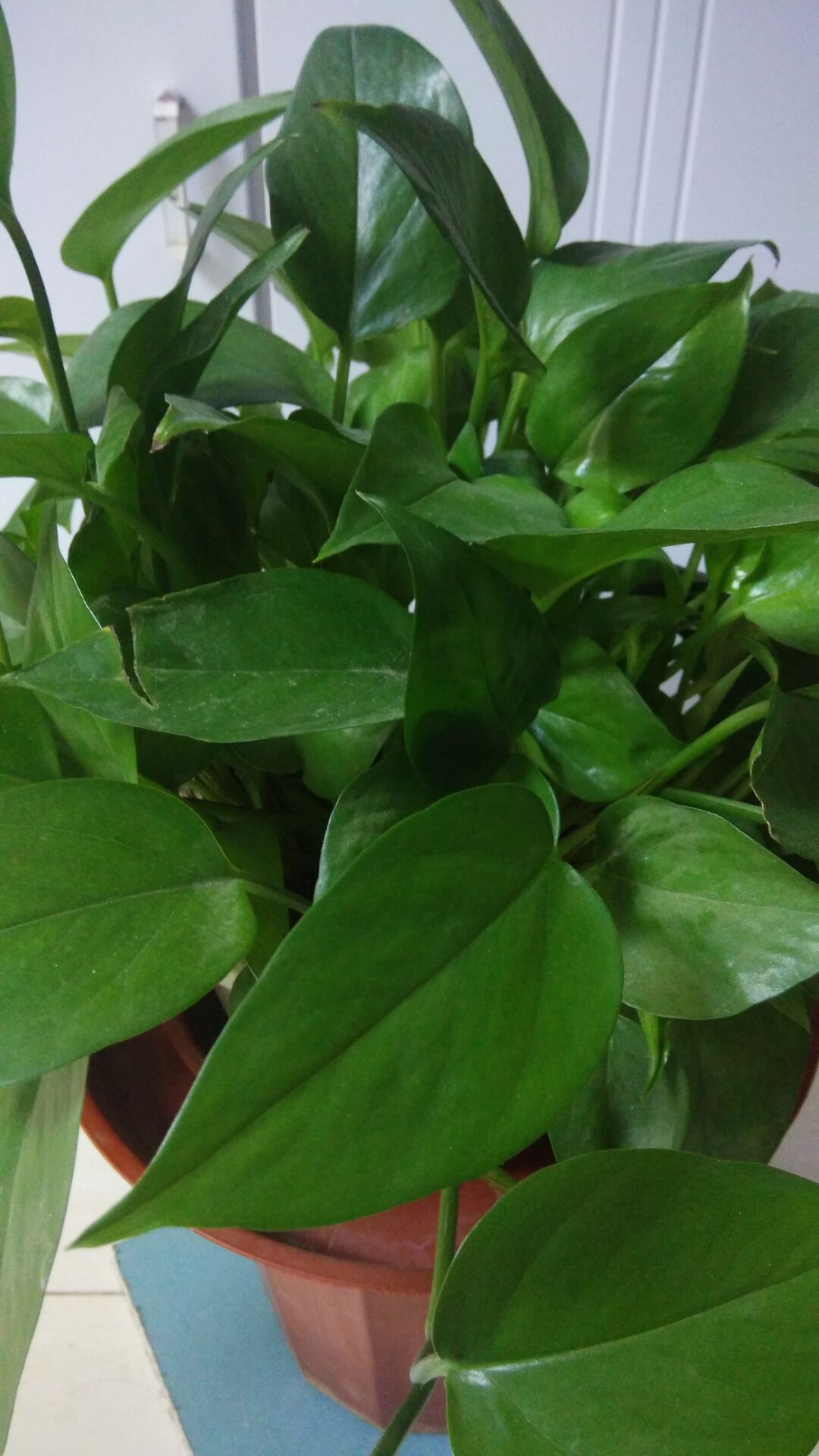 绿萝是一种草本植物。绿萝的叶子大的有巴掌那么大,小的有拇指那么小。刚长出来的叶子是完全卷曲起来的,像一条小虫子。叶子完全长大的话,你可以看到它的叶脉,有一条主脉长出无数条叶脉。绿萝的叶子非常挺拔高大,像一位士兵,有的藏在叶丛里,像一位害羞的小姑娘。