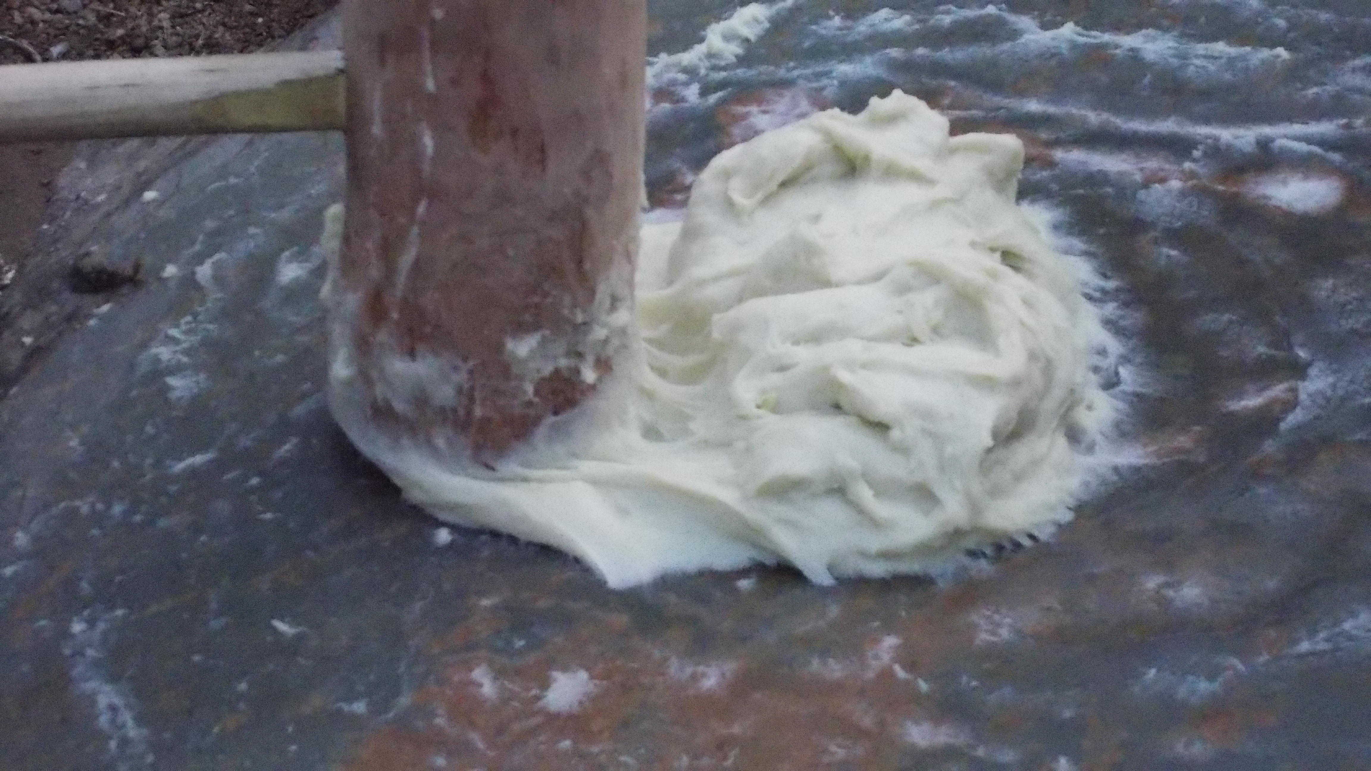 然后要用木锤反复的压挤,这途中要注意,千万不能使大劲,因为这样可能会把洋芋打到地上。只有打到快成团时,才可以使大劲。 这时候就是使大劲的时候了,你有多大力气,都要使出来,因为这样打的糍粑会更筋道。
