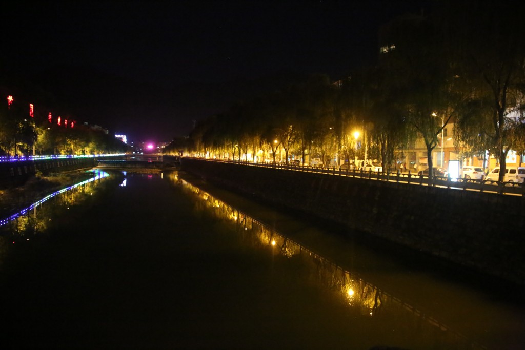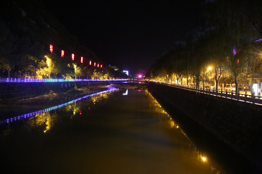 地上有着各个路灯,水中有着颗颗"繁星",水上水下闪烁着。两个世界,共同的祝福,祝你幸福安康,祝你万事如意,祝你合家欢乐。
